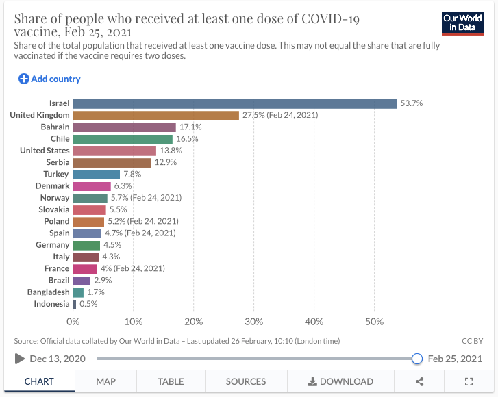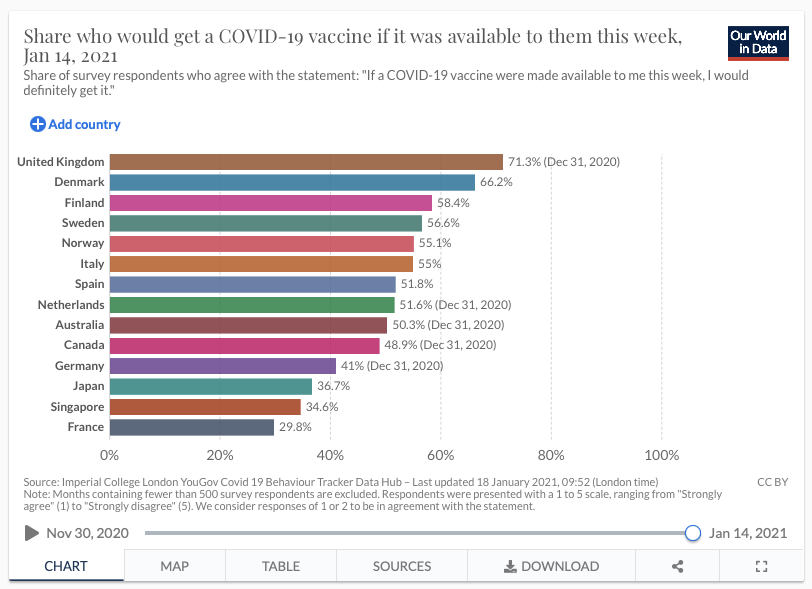 I was both surprised and impressed when I saw this graph on Our World in Data. It has the UK at the top of the list for vaccine acceptance. Perhaps it’s because we’ve been hit so hard by the pandemic or perhaps the British are just a sensible bunch of people but whatever the reason, the country that created the “vaccines cause autism myth” which fuelled a global anti-vaccine conspiracy movement is now the population most likely to want to get a vaccine.