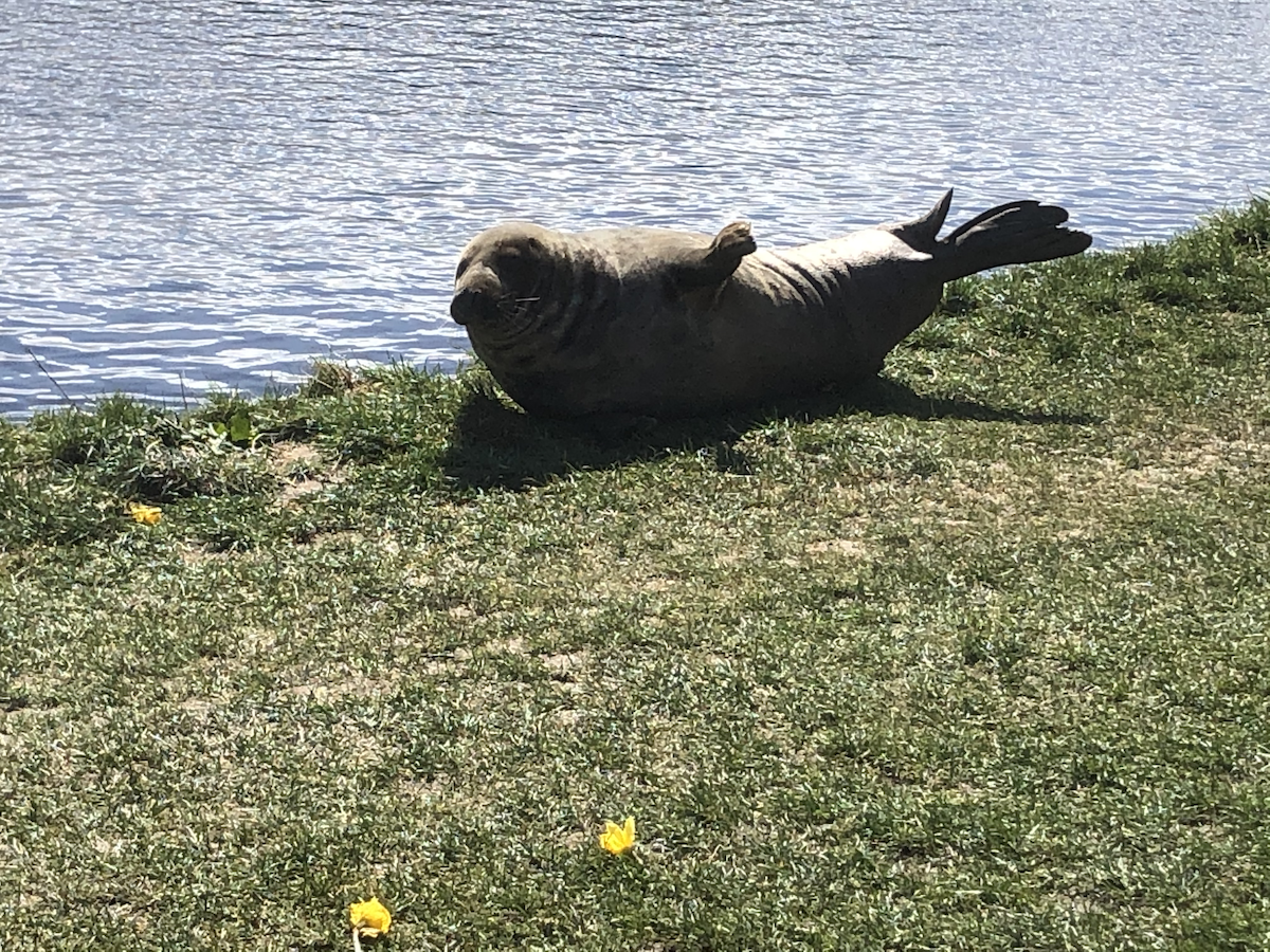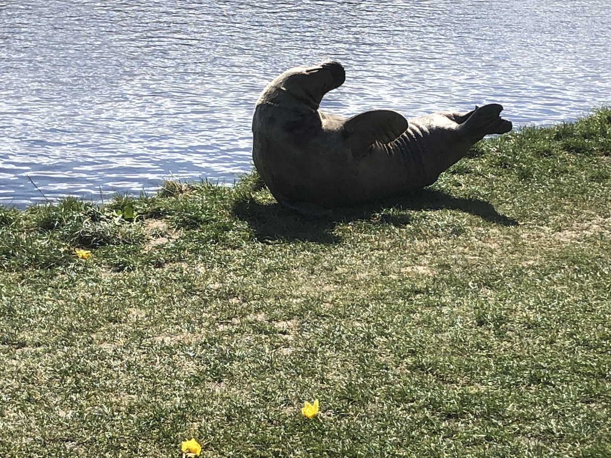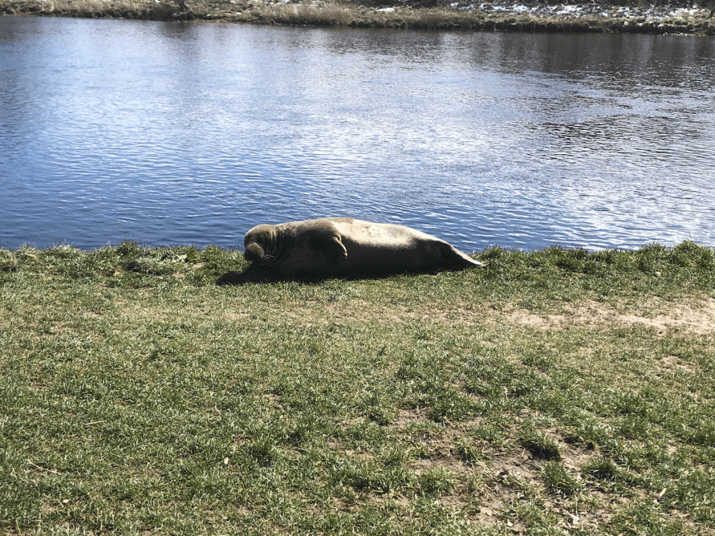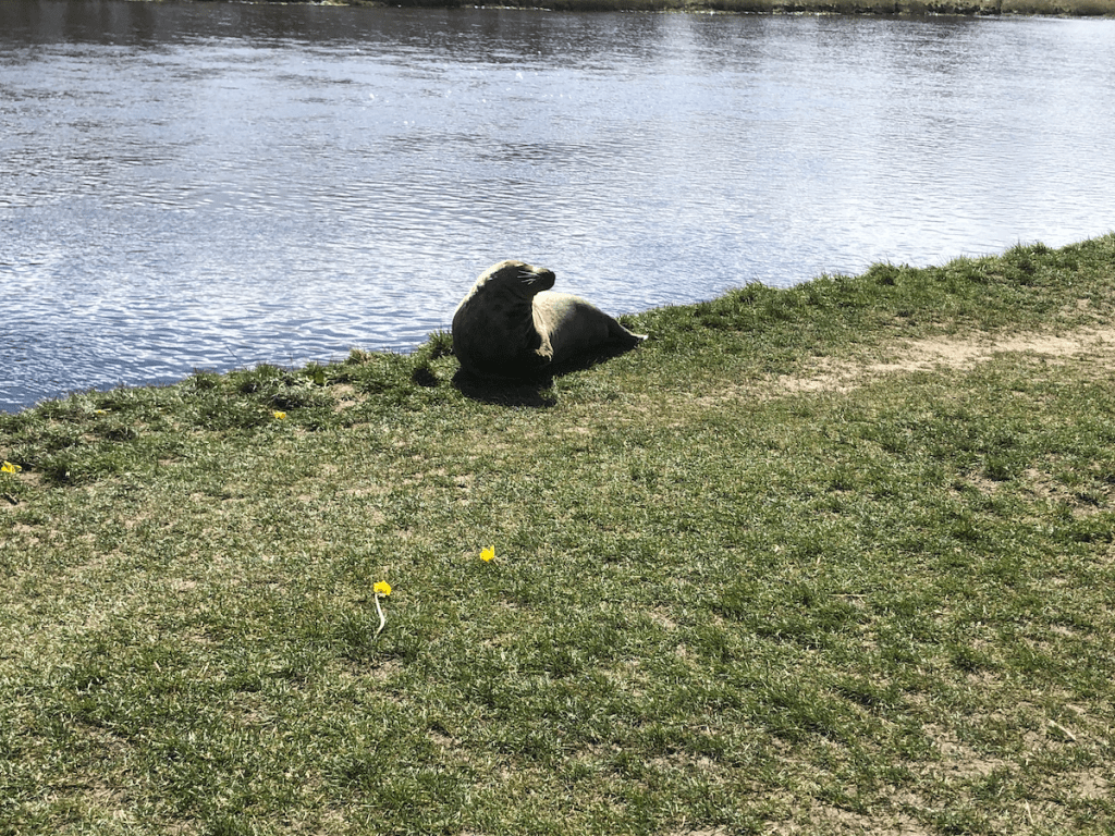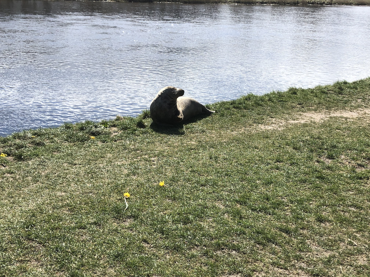 On his walk yesterday Ben saw a seal on the banks of the River Dee and took these great photos and video. We sometimes see seals swimming in the Dee but this is the first time we’ve seen one sun-baking on the bank. This part of the river bank is quite busy with people walking their dogs so the seal was very brave. It seemed to want to put on a bit of a show for the audience.