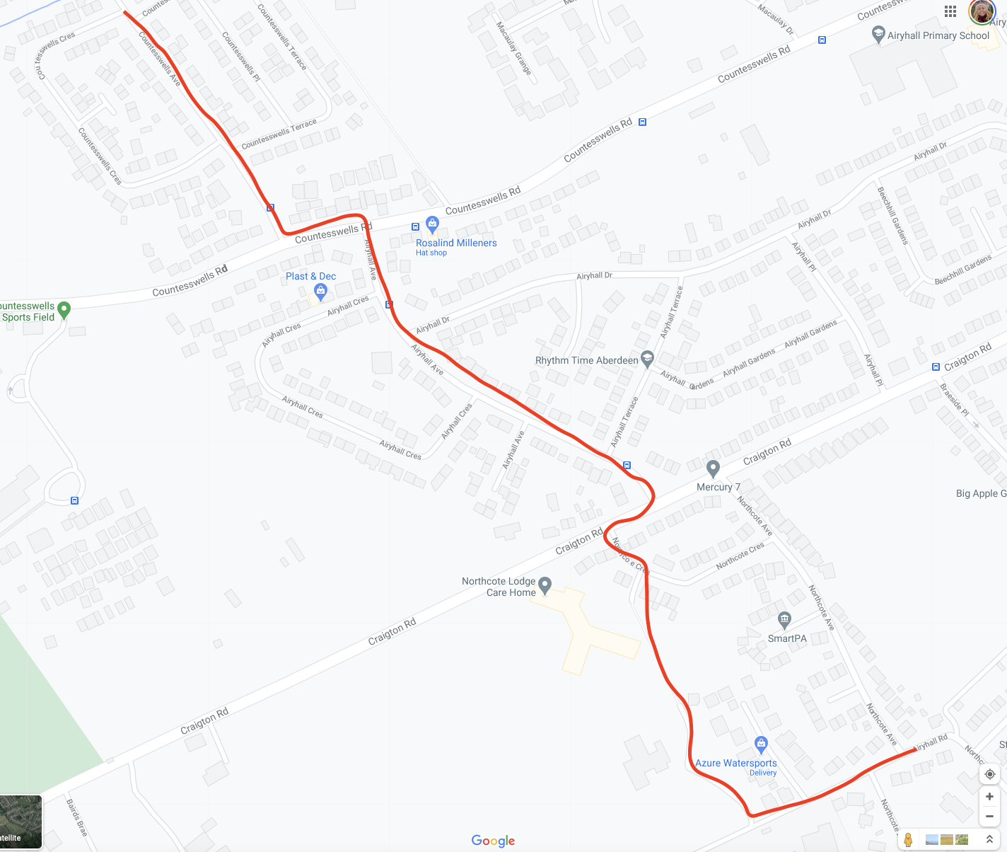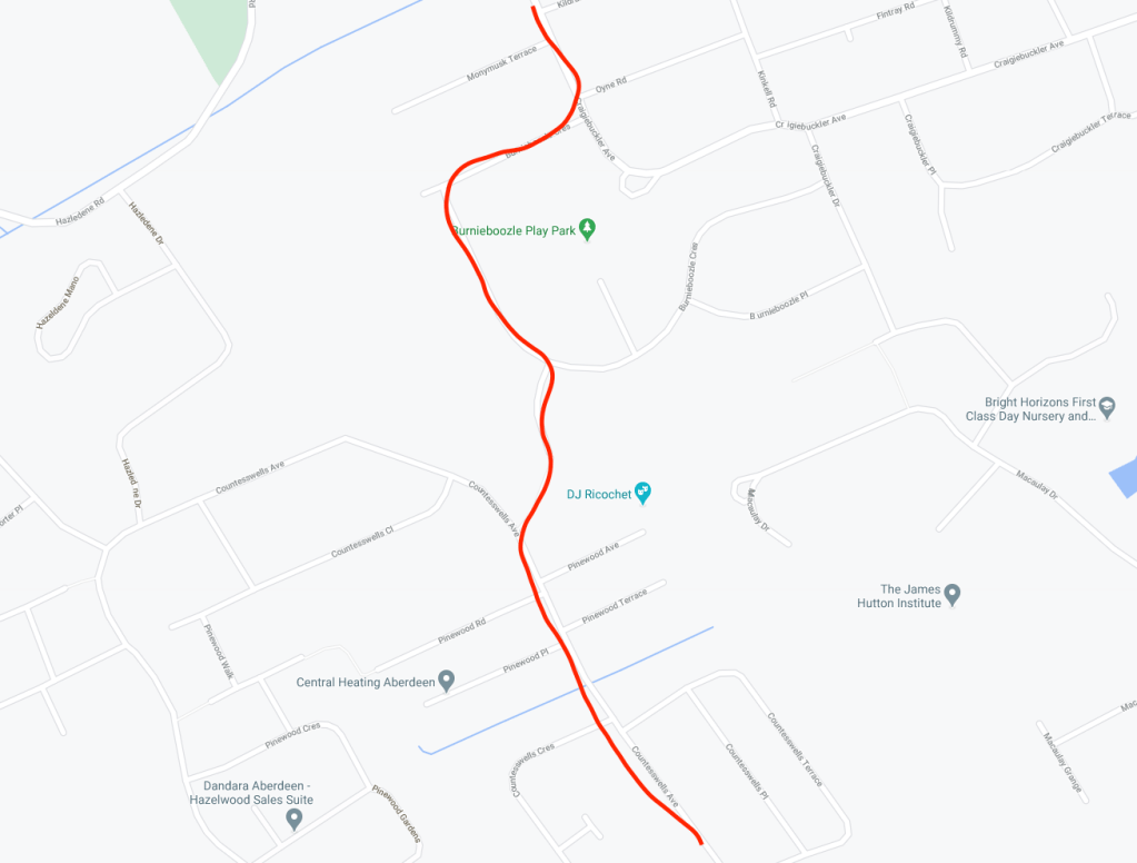 From here we did a dog-leg around Craigton Road and onto Airyhall Avenue. Then another dog-leg around Countesswells road and onto Countesswells Avenue.