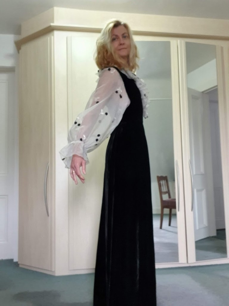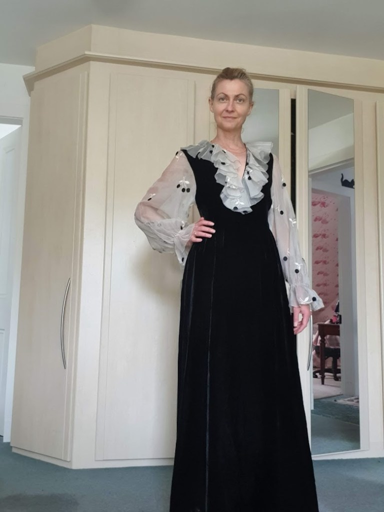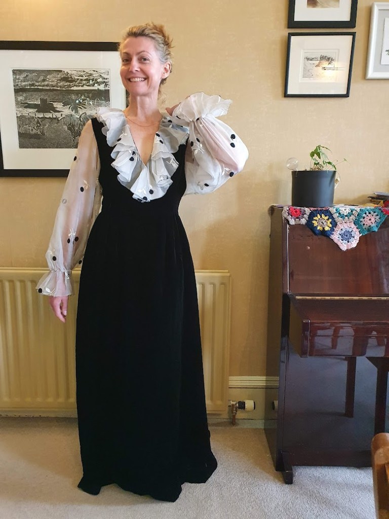 My latest addition to the vintage clothing collection is this gorgeous 1960s velvet dress with organza ruffling and a plunging neckline.