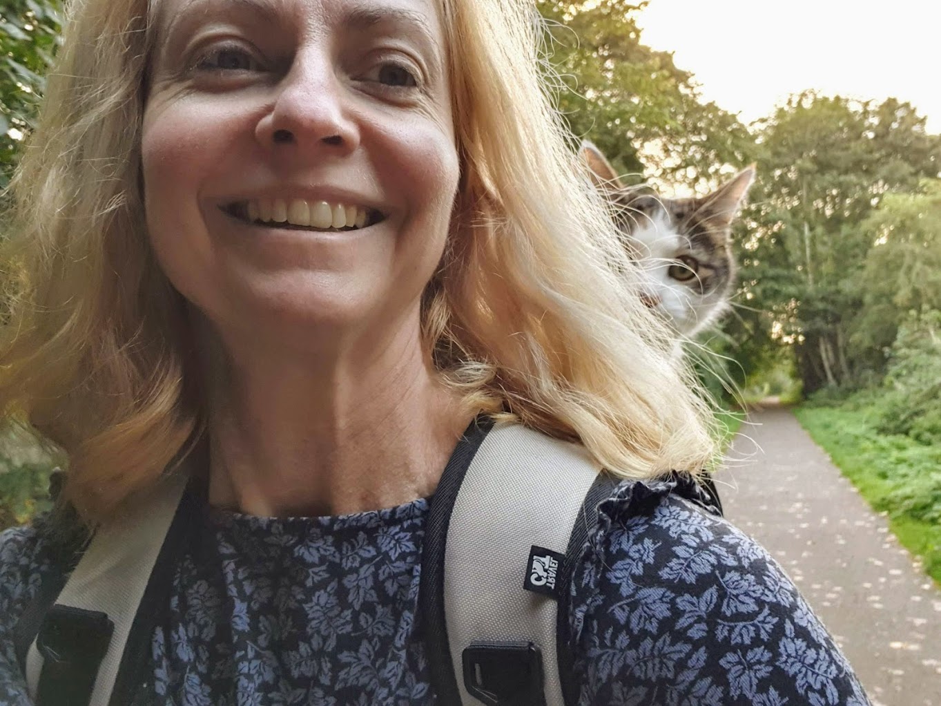 Just when I was about to turn around and return home she jumped out and took off! Fortunately I managed to pick her up again before she disappeared and I decided to walk her back home in my arms. When I got to our back gate I half slipped, although I didn’t quite fall over, but this must have frightened her because then she lashed out at me scratching my neck. Next time I will be sure to either close the top flap or put her harness on so she can’t jump out.