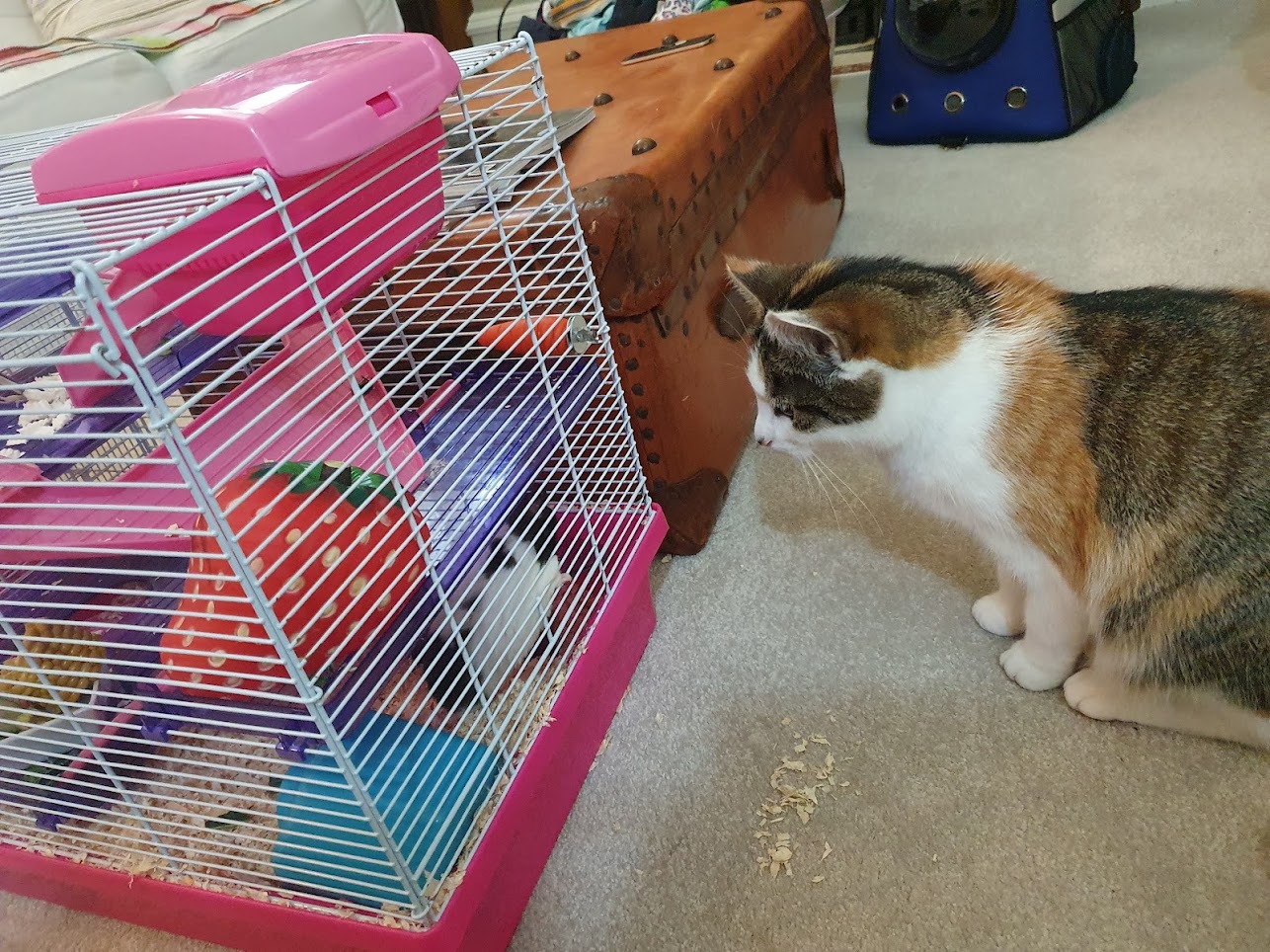 I was a little worried about how the cat would react and at first she was scared and ran away. But later she came back and sat watching them for a while but now she’s lost interest. Here she is meeting Elizabeth’s hamster, Daisy.