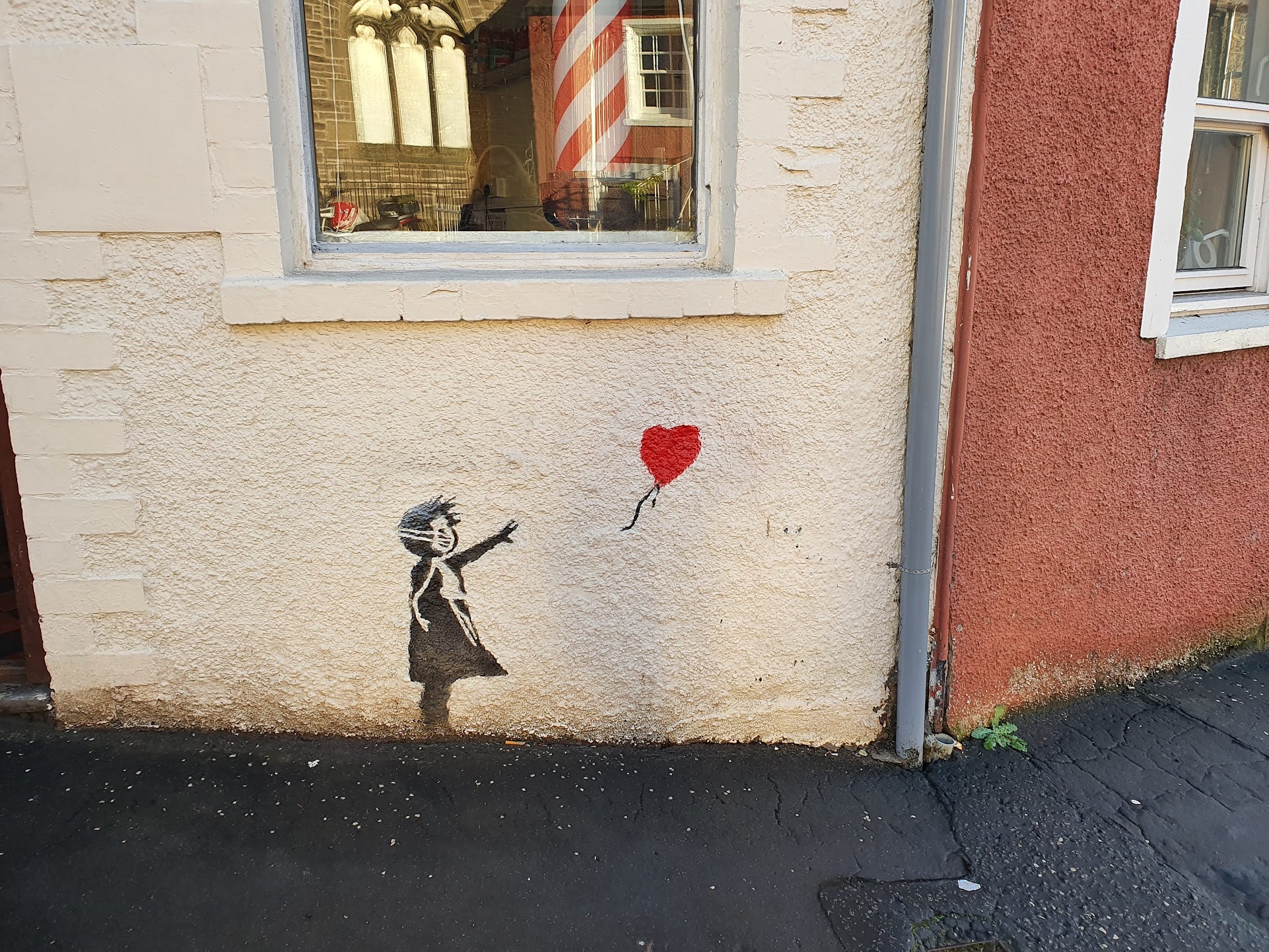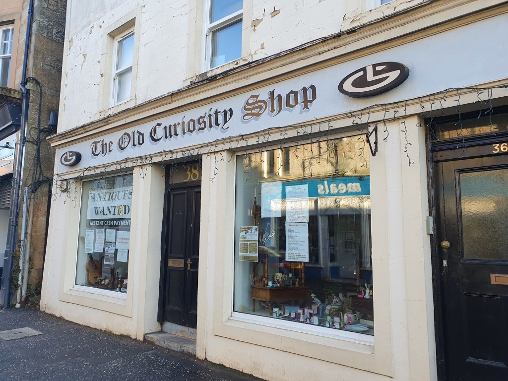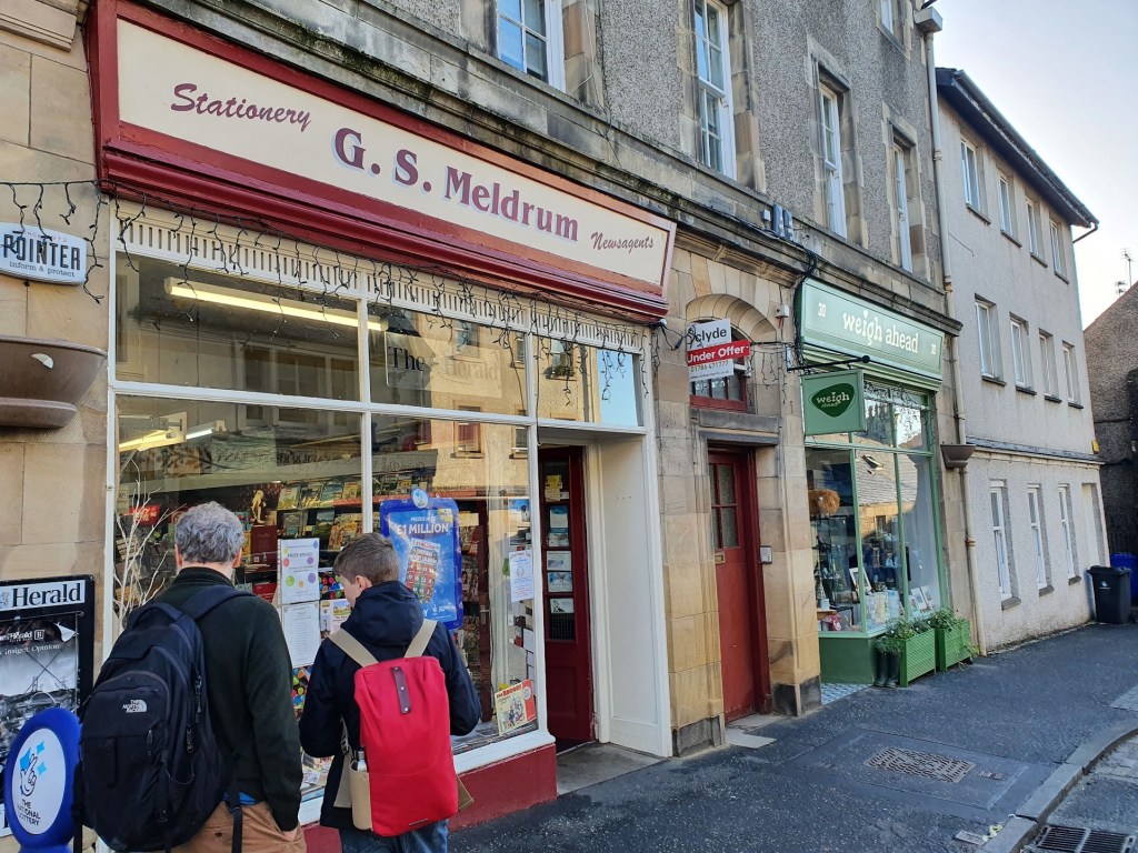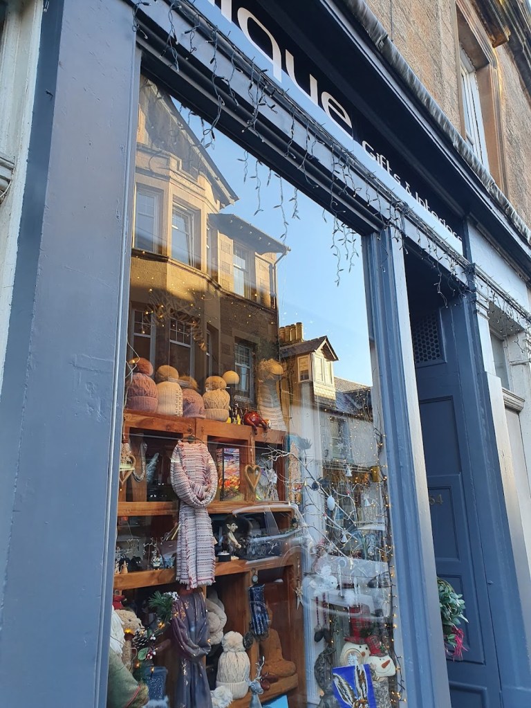 We’ve come to Dunblane for the weekend, a picturesque Scottish village in Perthshire, about 110 miles southwest of Aberdeen. The village is beautiful with lots of quirky shops and an attractive river running through the middle called Allan Water. There’s also a cathedral that dates from the 12th century. There’s a fake Banksy outside one of the shops. The owner told us he doesn’t know who painted it.