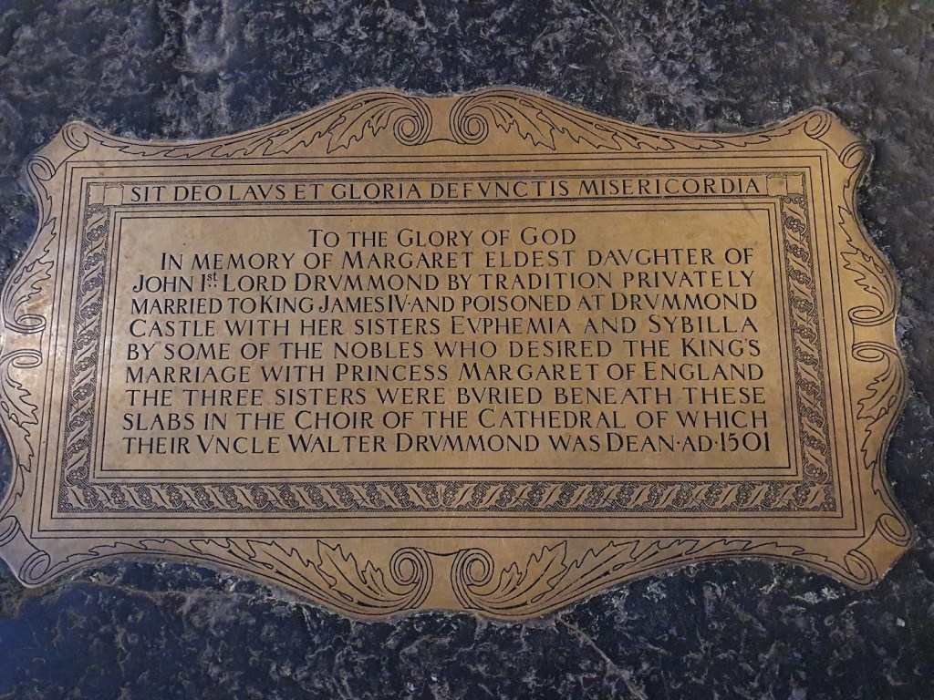 There’s a plaque on the floor of the cathedral (in the gallery above) which says Margaret Drummond is buried here with her two sisters after being poisoned. Margaret was a mistress of King James IV and there was a suspicion that he was planning to marry her or had secretly married her but Scottish nobles instead wanted him to marry the English princess Margaret which necessitated the removal of Margaret Drummond. This is just a theory. You can read more on the Wikipedia page.