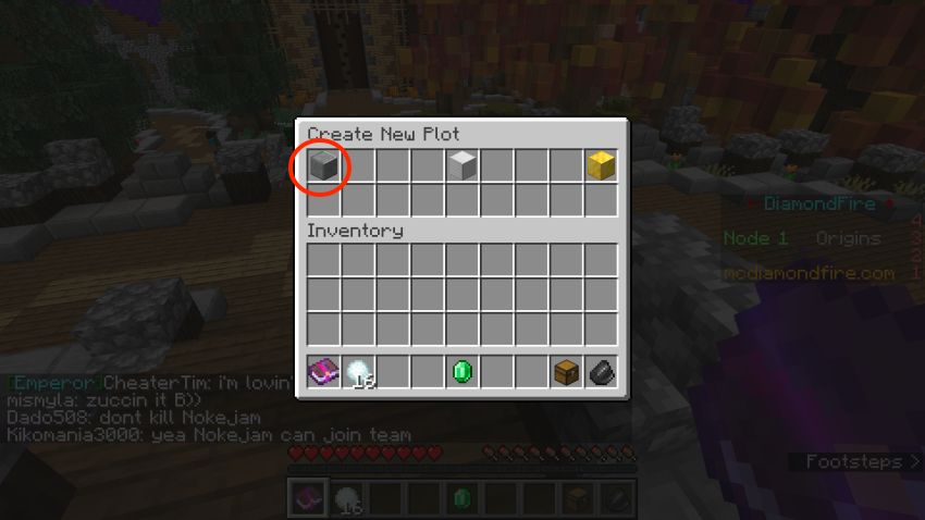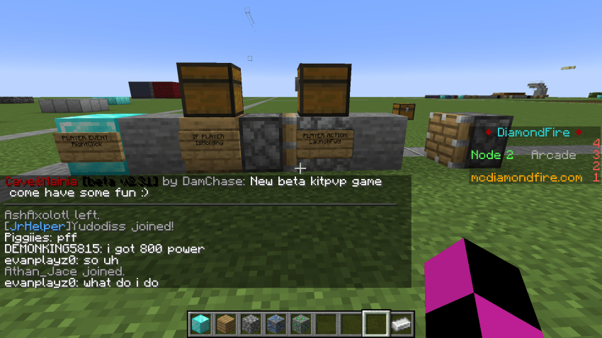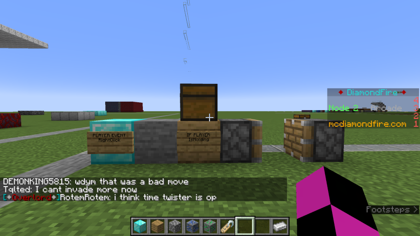 I suggested to Daniel that he write an easy beginner’s tutorial to help someone new start coding in DiamondFire and he put together a little program that launches the player forward if they right-click while holding a diamond sword. He explains how to do it below: