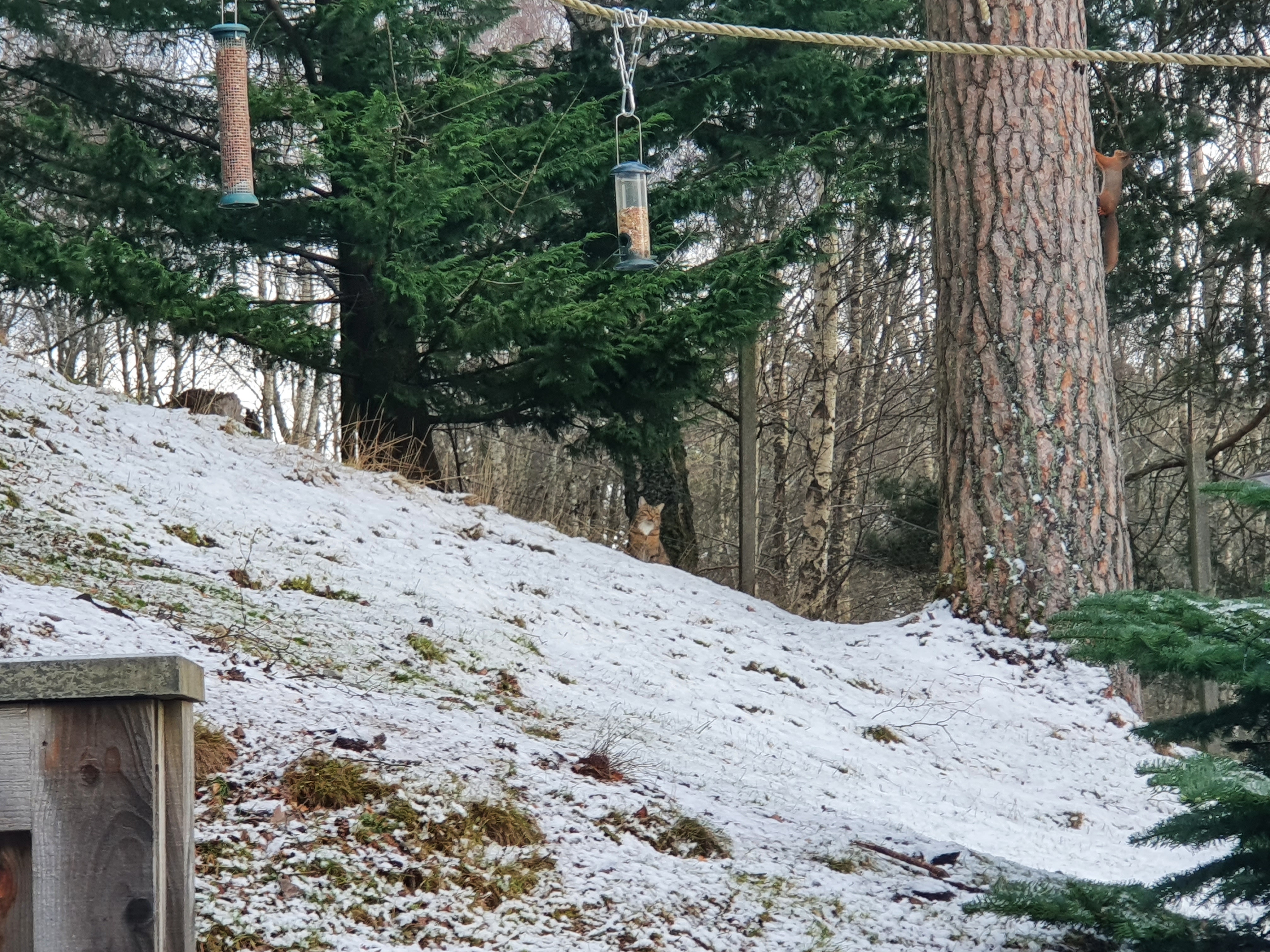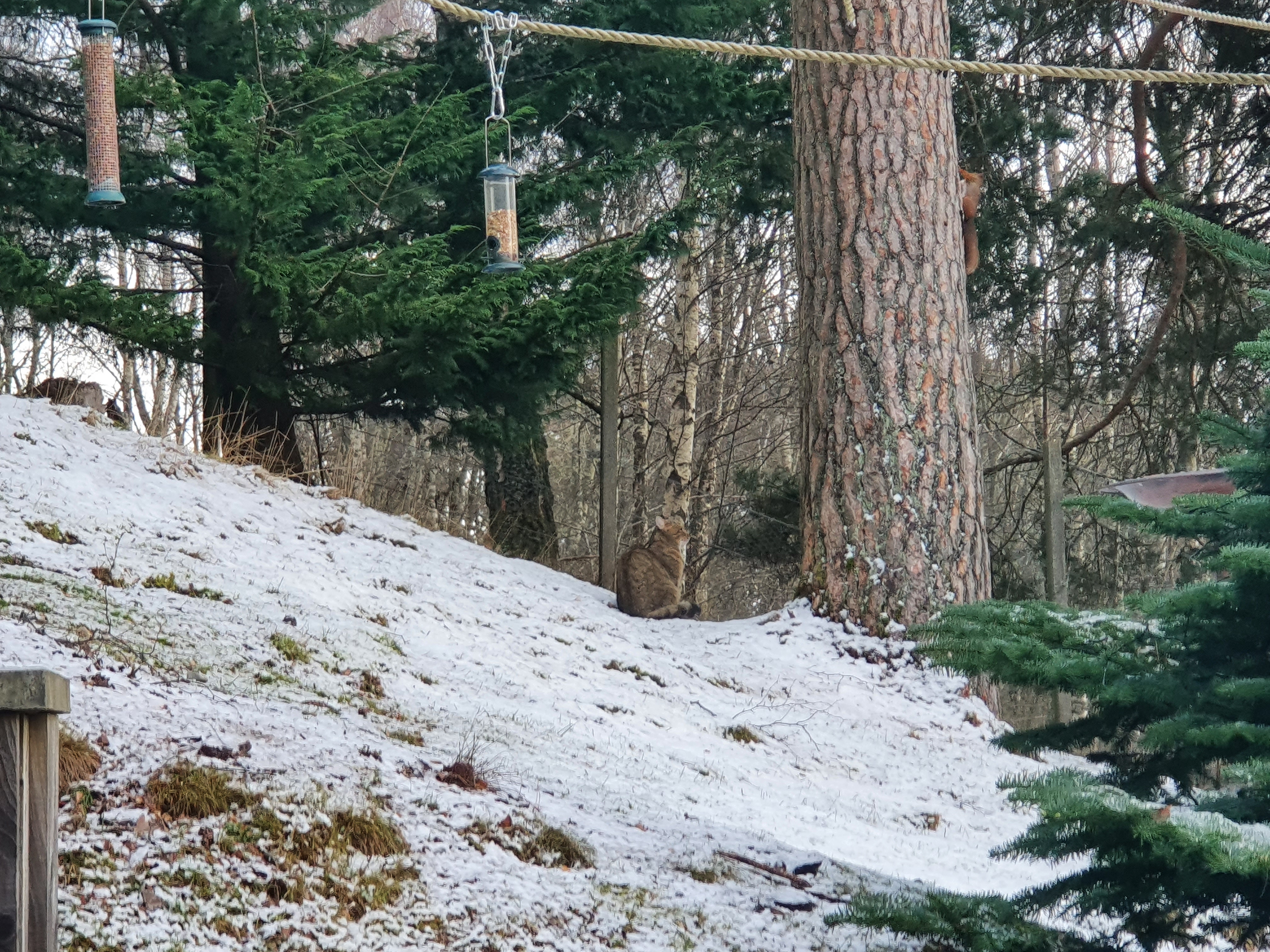If it is a Scottish wildcat then we are very privileged indeed. It was stalking a red squirrel. I’m going to upload these photos without resizing them so that people can zoom in if they want to. Usually, I resize photos for my blog to make pages faster to load so these photos are big and this post will be slower to load than usual. I’m sorry for this. Here are three photos. Two with the cat on the ground watching the squirrel on the tree trunk and a third with the cat on the trunk.
