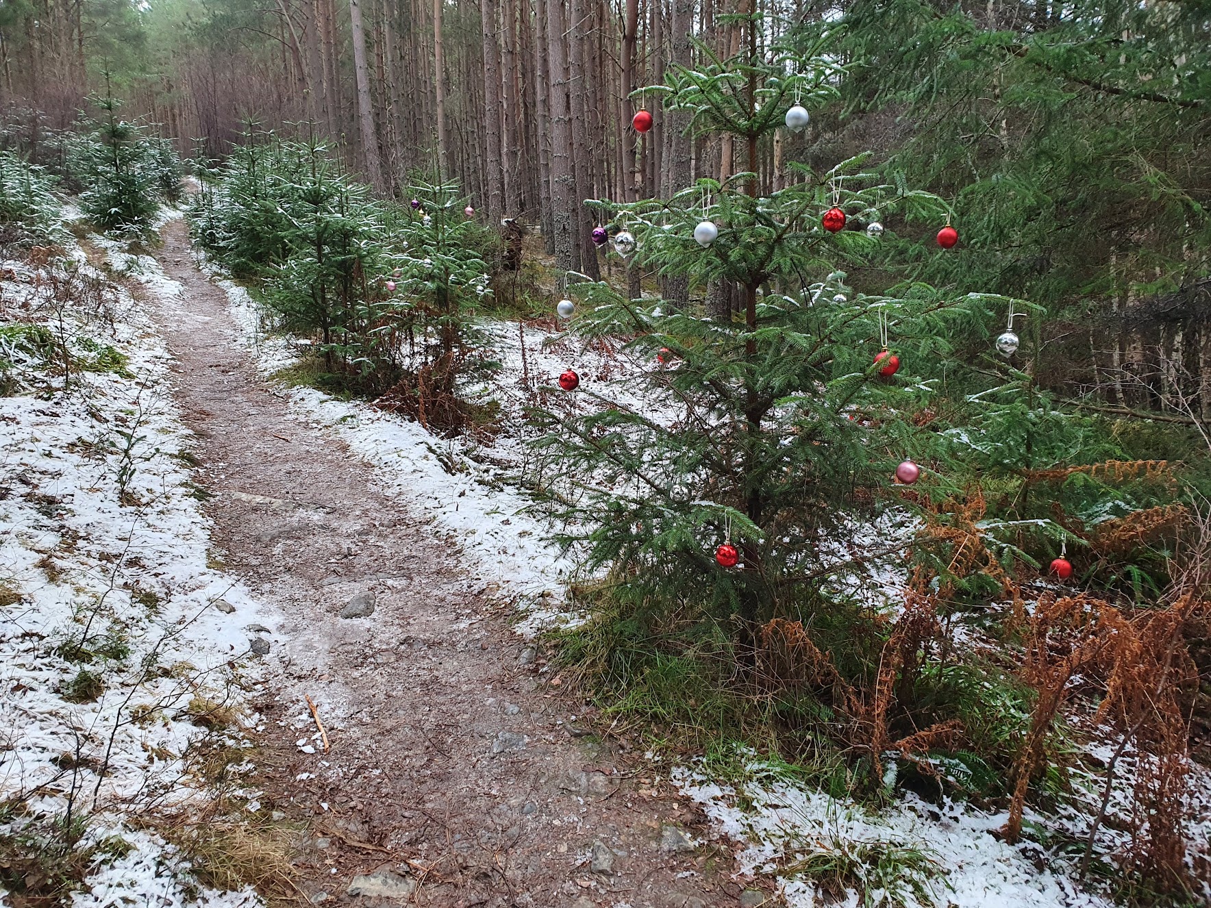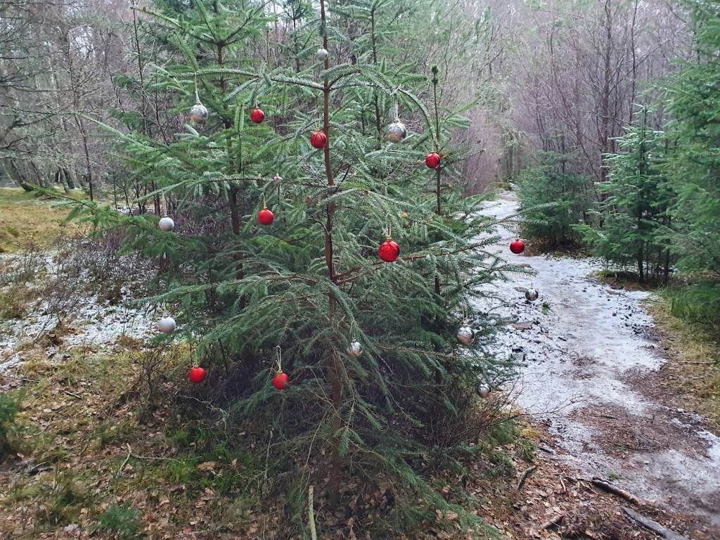 Someone has decorated trees in the nearby forest for Christmas.
