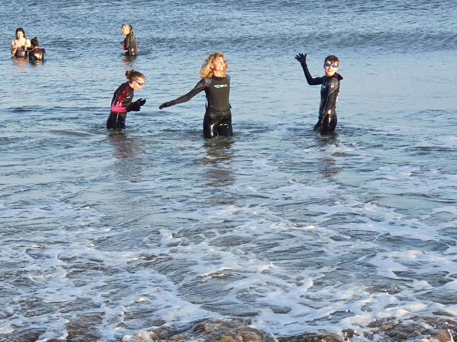 We all got wet suits for Christmas so we decided to christen them at the beach in Aberdeen today. That’s Daniel and Elizabeth in the centre of this next photo venturing in together.