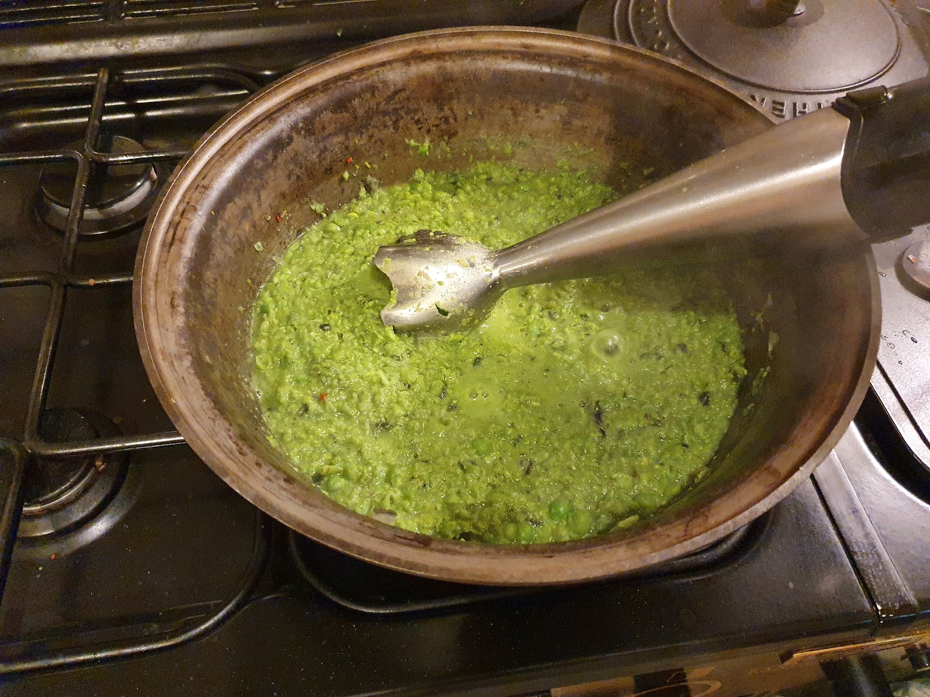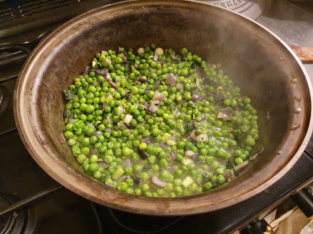 I also put water in but didn’t measure how much so just add water to produce a soup of your desired thickness. Here are the peas and onions in the saucepan.