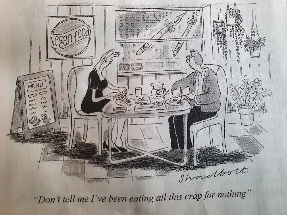 I’ve had to do a lot more cooking than I would normally have done as once a week we’d normally get takeaway and on one or two other nights we’d have frozen ready meals like frozen vegan burgers or sausages. It’s this aspect that I’ve found most difficult. If only the food industry would stop filling foods with salt and sugar but they will only change if consumers demand it and as usual I find myself in a minority. I’m reminded of this cartoon I saw in Private Eye magazine recently.