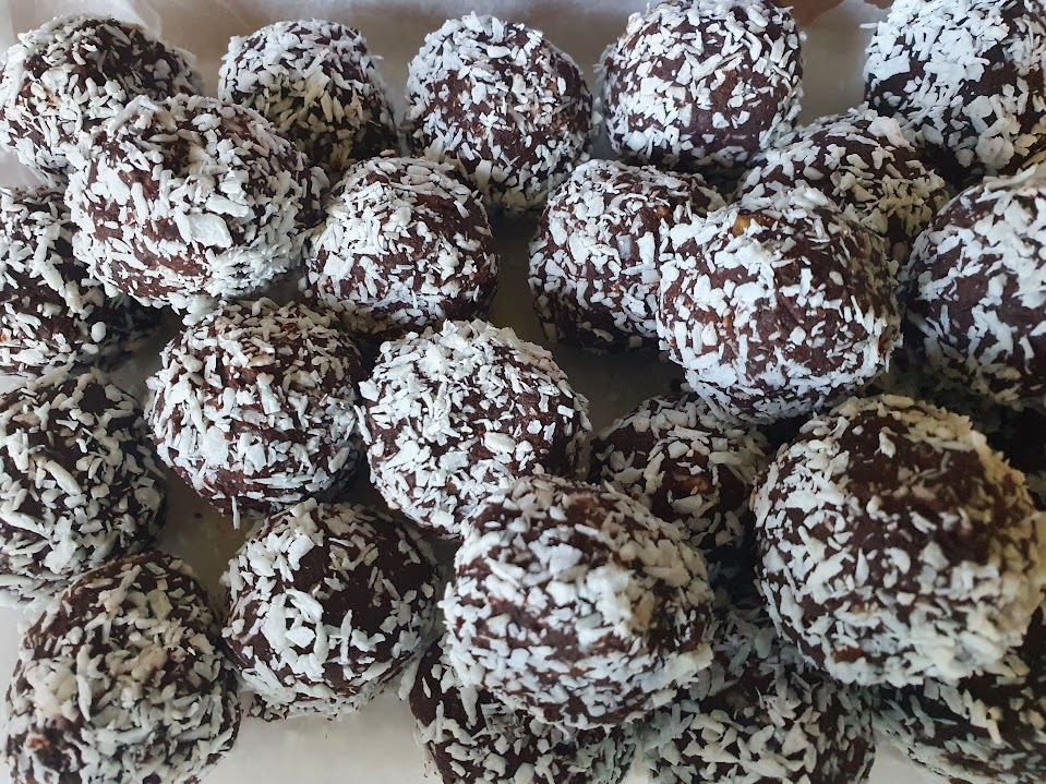 Mix everything up (except the coconut) in a food processor then roll into balls. Roll each ball in the desiccated coconut then refrigerate.