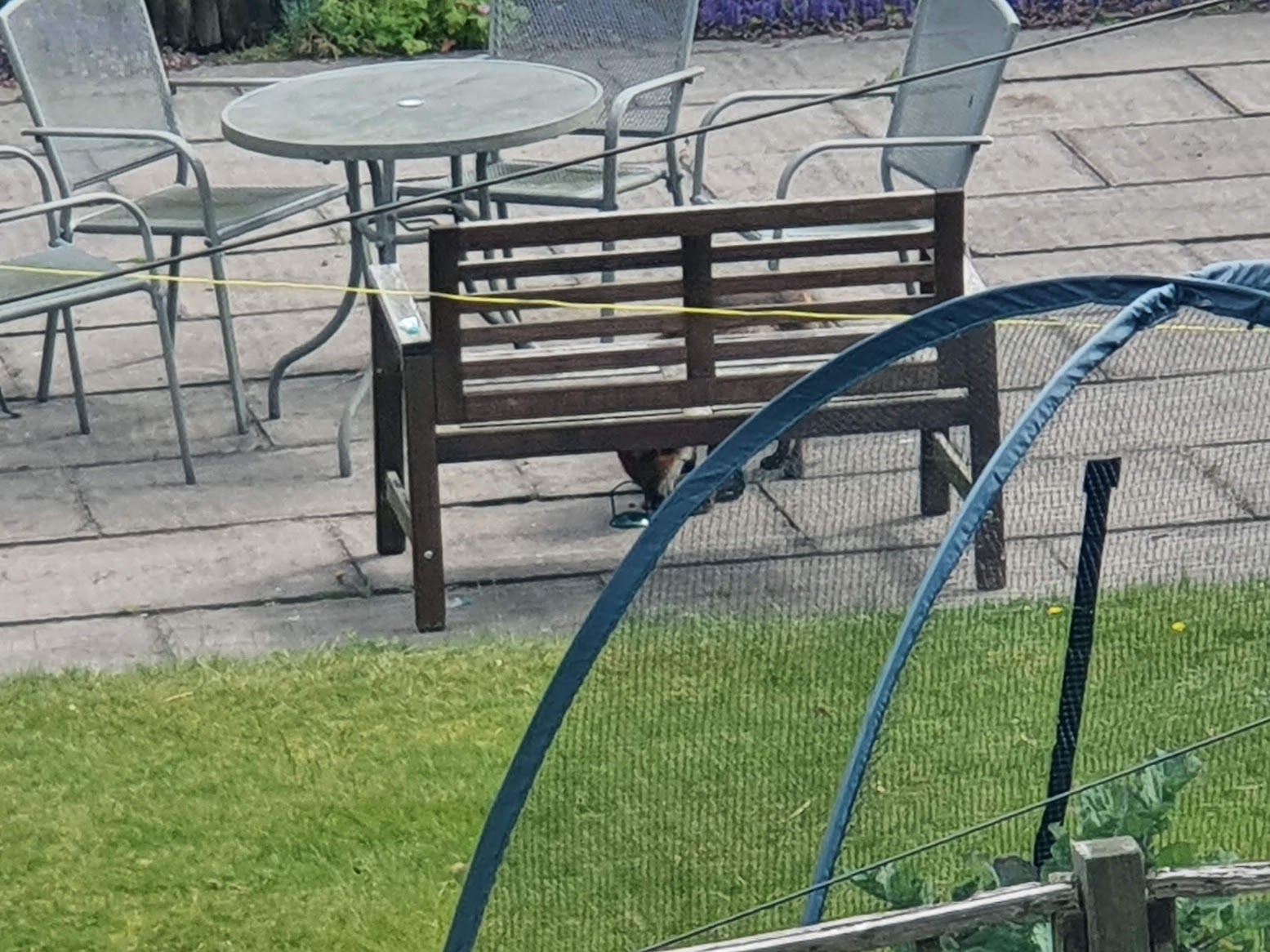 We were all very excited to see a fox in our backyard today. We sometimes see foxes in the neighbourhood but this is the first time we’ve seen one in our yard. He was eating the peanuts from a bird feeder that had fallen to the ground. At first I thought it was a dog as I could only see some brown legs behind a brown bench.