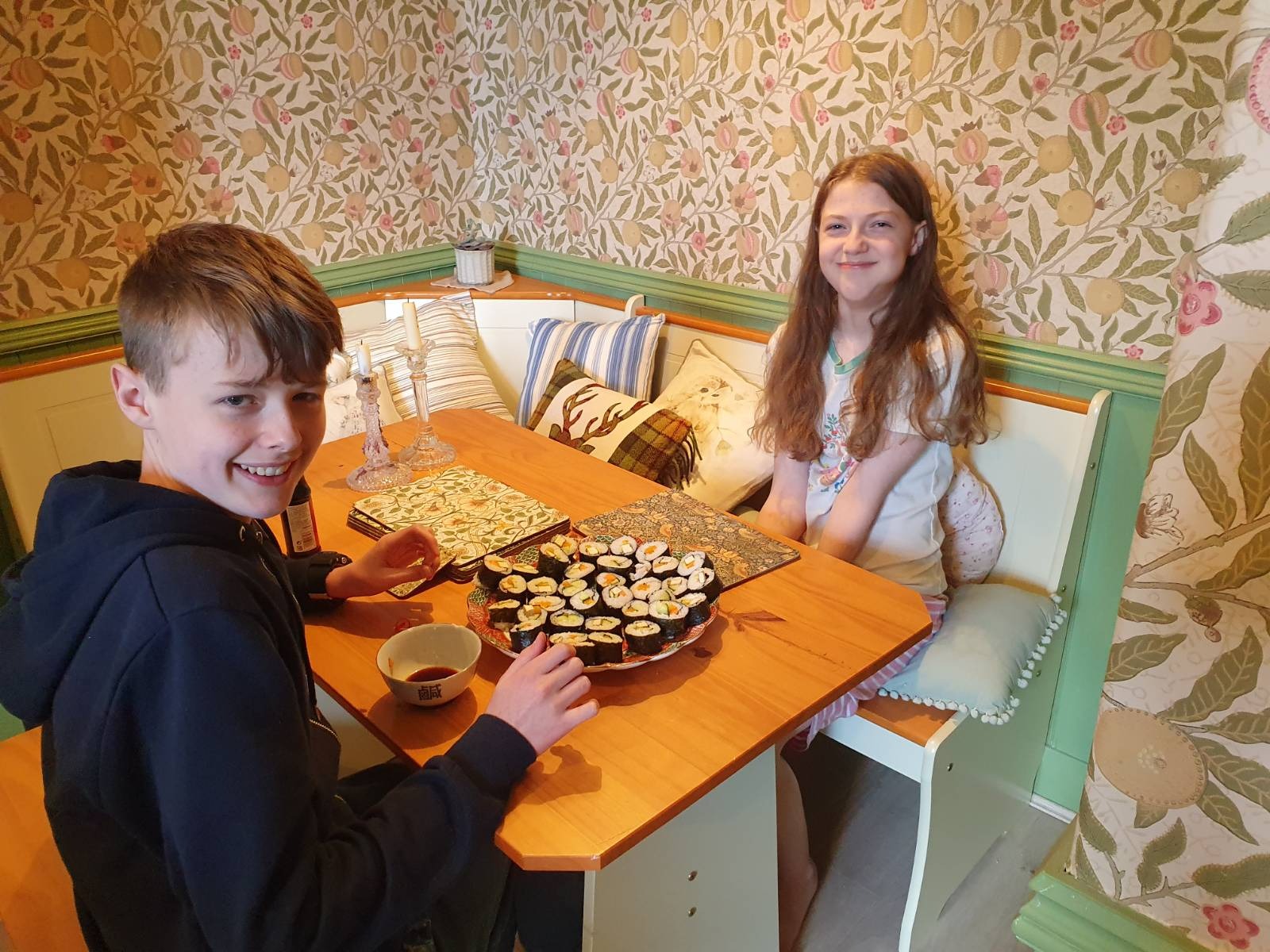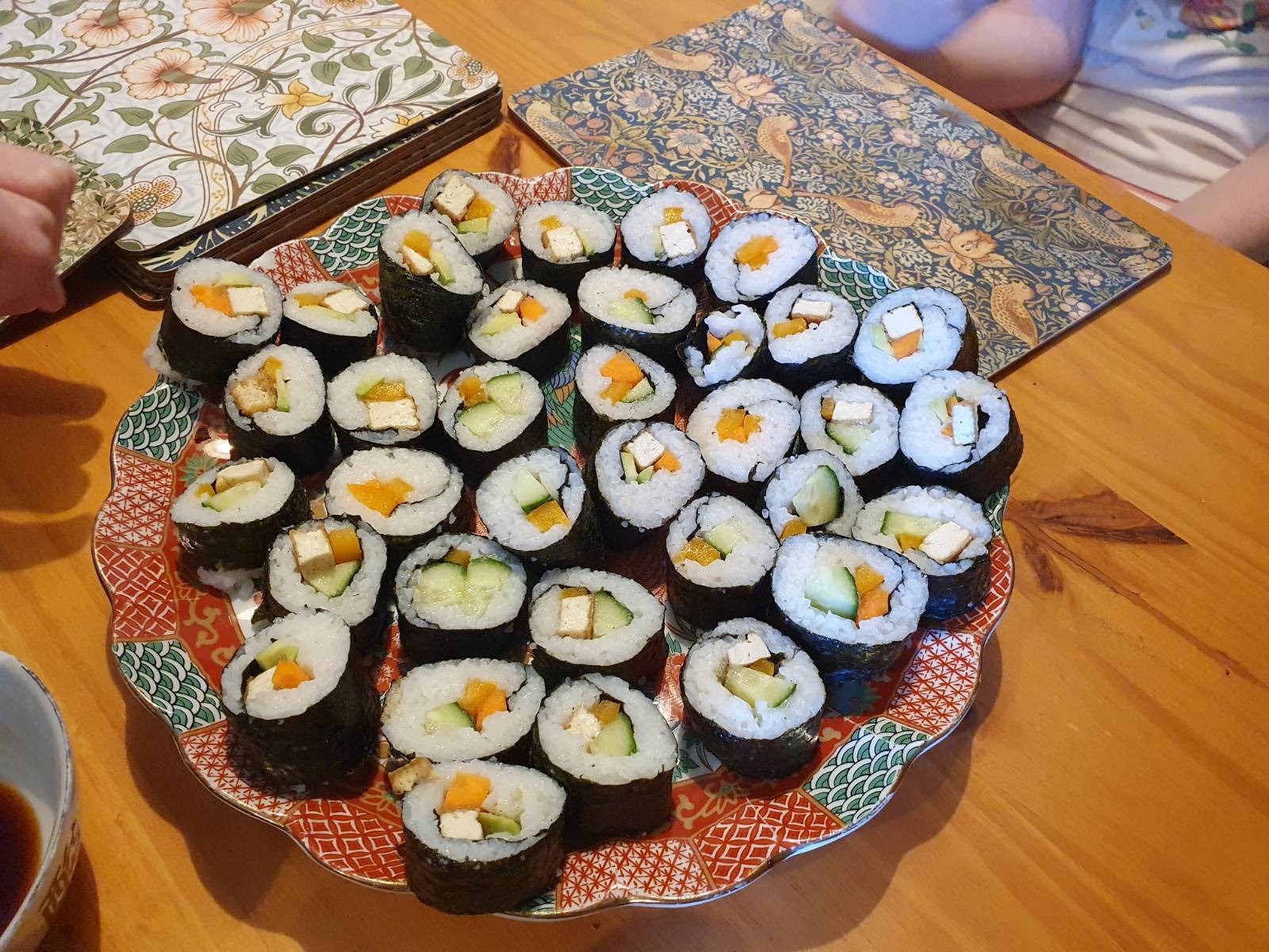 Yesterday I made sushi for dinner. It has been years since I’ve made sushi. I had a Japanese flatmate when I was at University and he showed me how to make it. It’s very easy. The kids loved it and polished off this whole plate. I used tofu, carrot, capsicum, avocado, and cucumber for the filling.