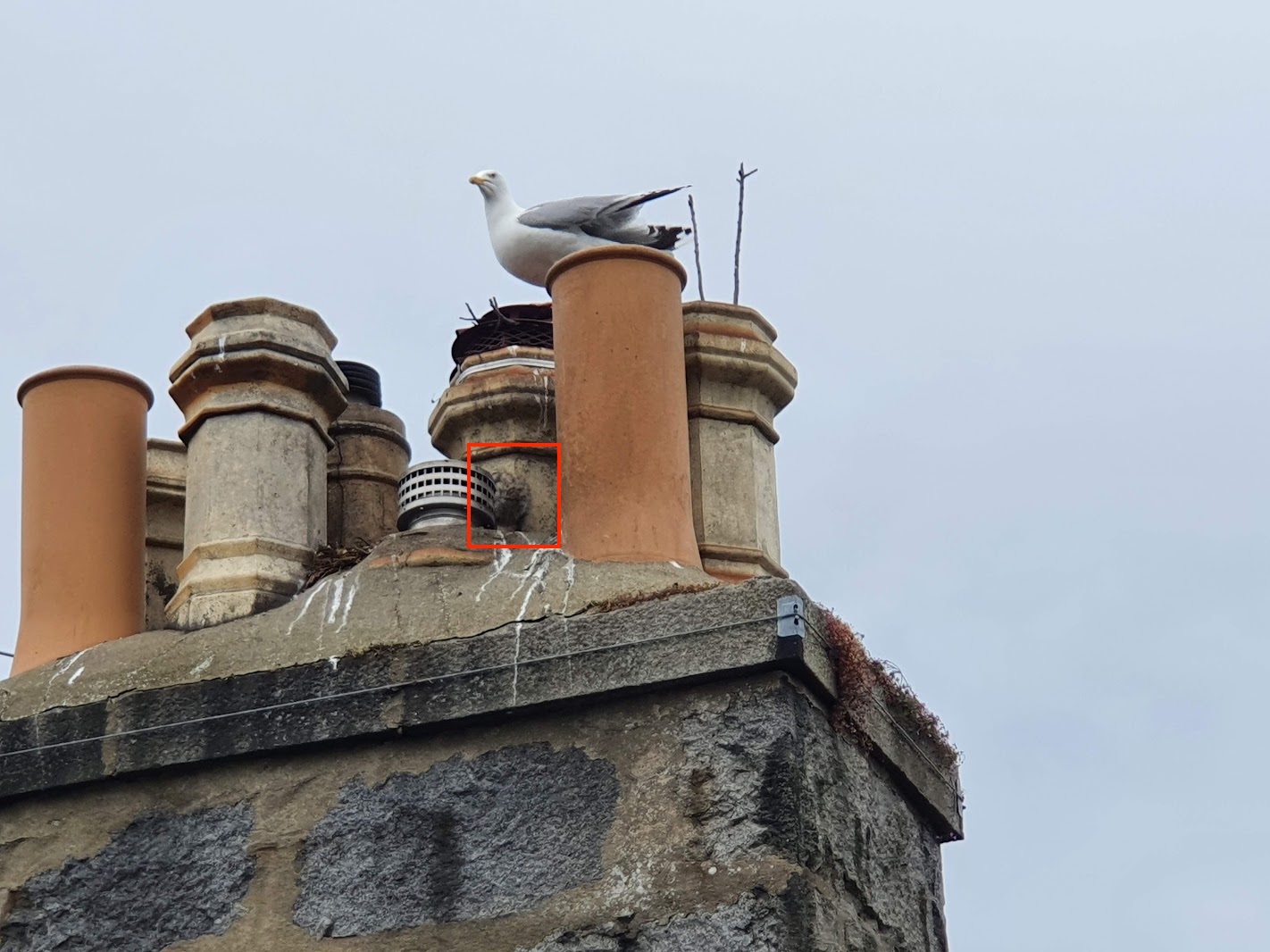 The herring gull nesting in the chimney pots on our roof is now a parent as yesterday I spotted a chick. It’s hard to see in this photo so I’ve annotated around it with a red box. I don’t always see it as it’s behind the metal chimney but sometimes it peers out the side or over the top. It’s a cute little fluffy thing.