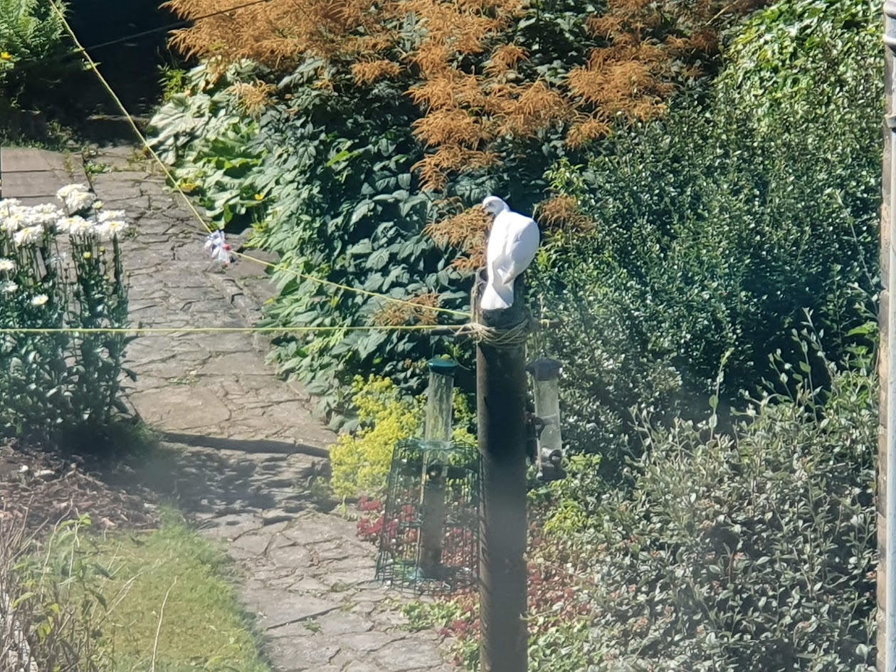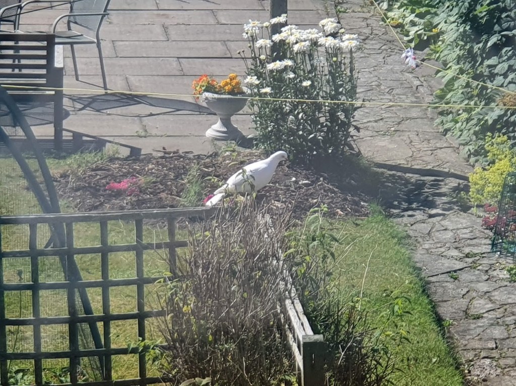 A white pigeon has started visiting the bird feeders in our backyard. I’ve never seen one before. I wonder if it’s an escaped pet? Or maybe one of many released white pigeons at someone’s wedding?