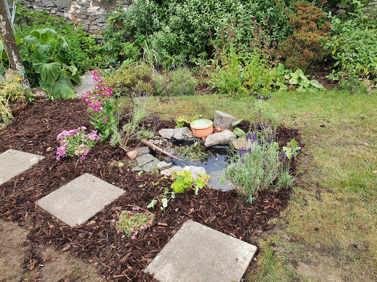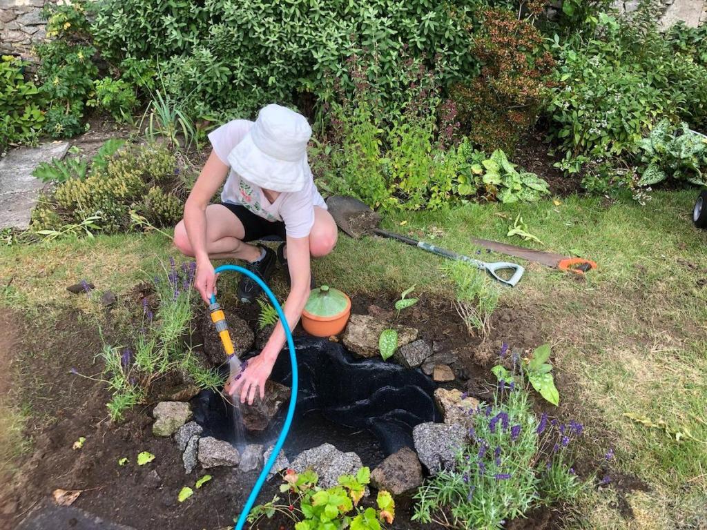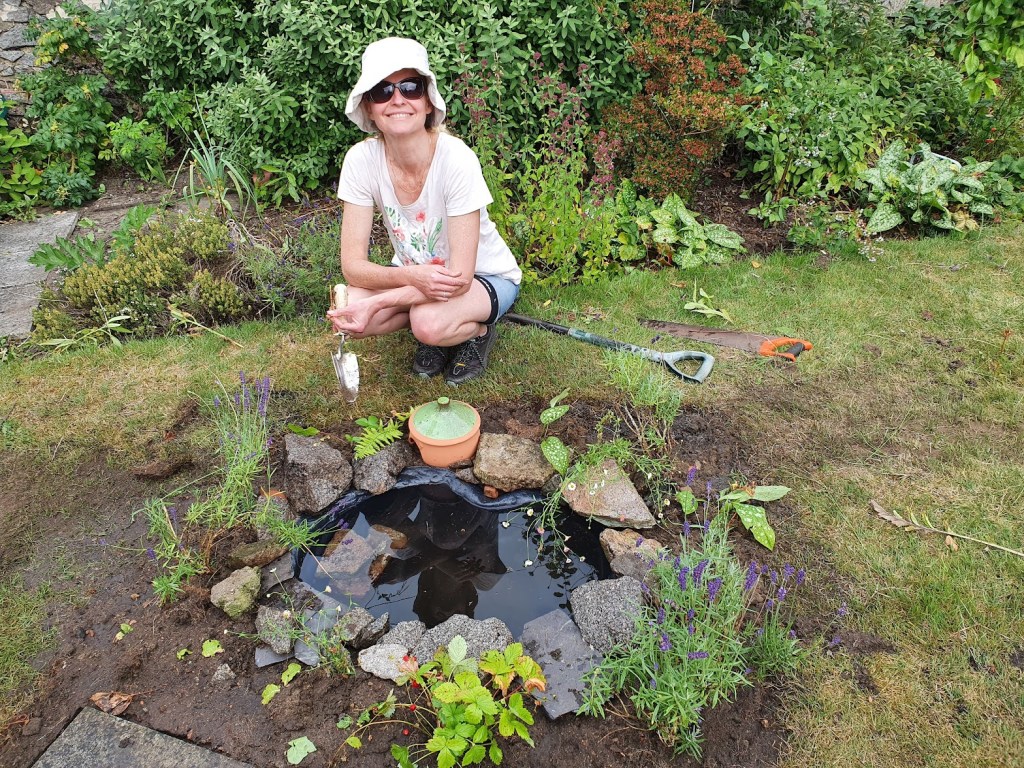 In hindsight I realise this pond is a bit small; we should have been more ambitious and done something much bigger. As Ben did the digging he disagrees. Maybe in a few years we can upgrade and get the kids to do the digging.