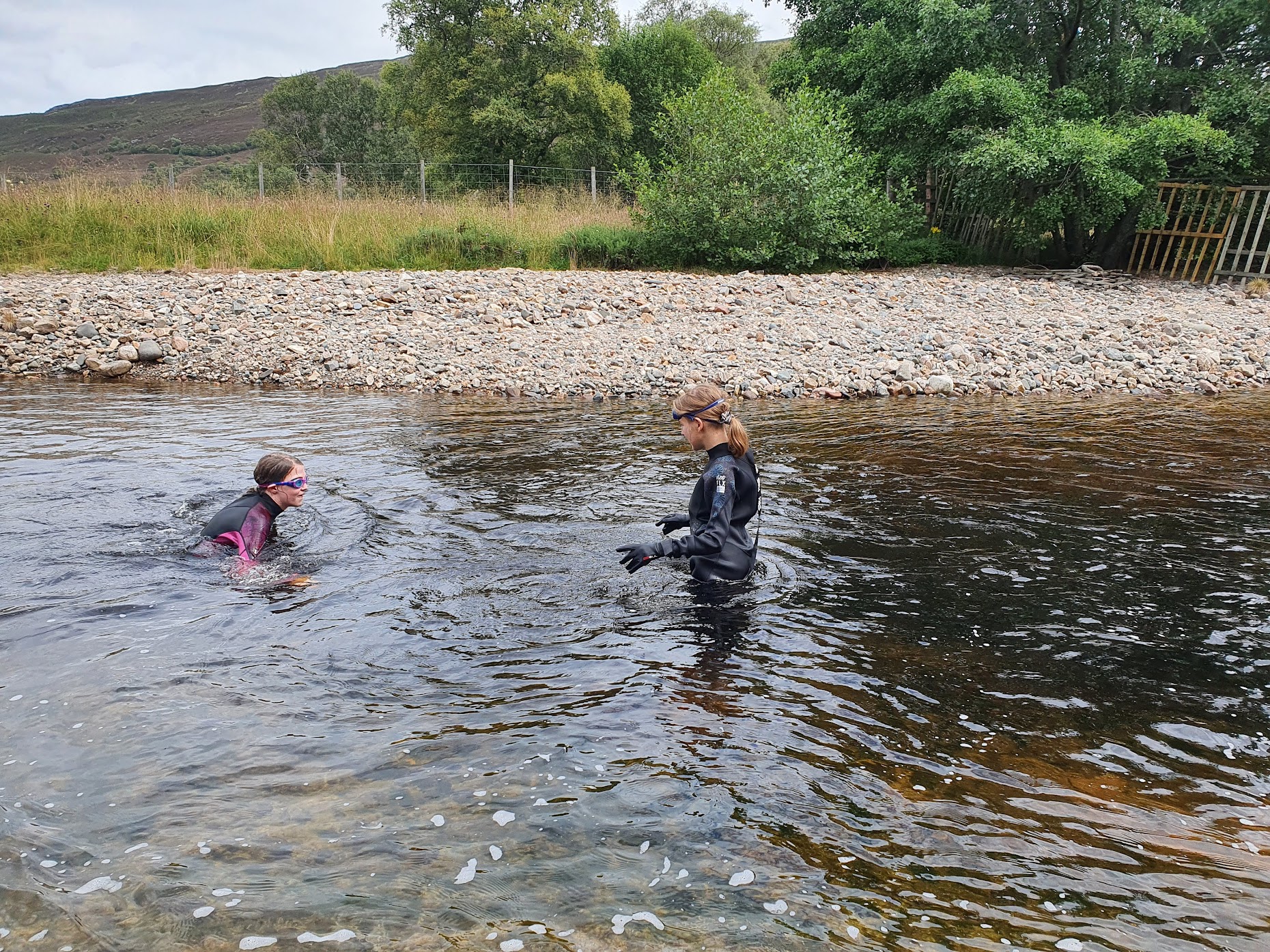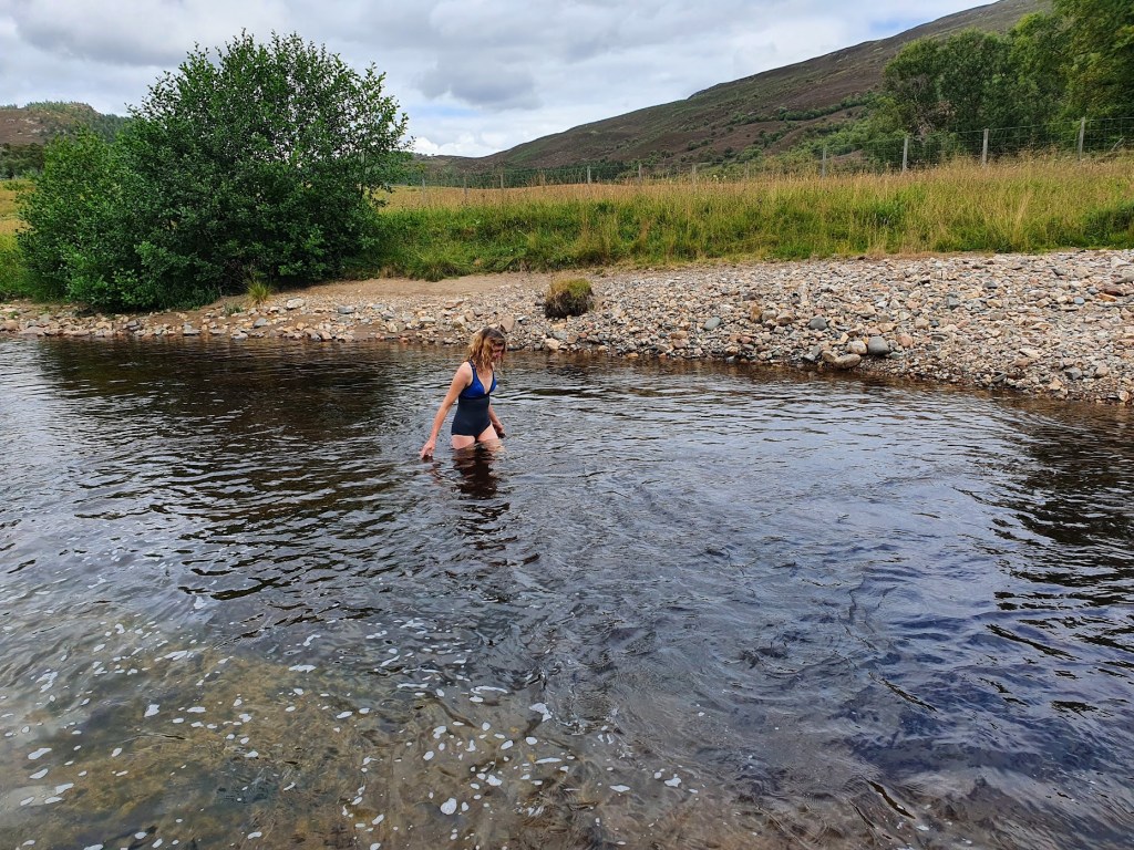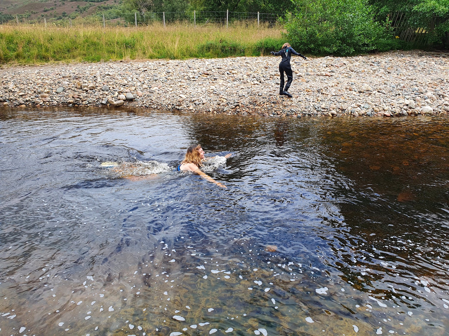 We swam in Clunie Water in Braemar yesterday in the same spot we swam over the summer last year. It was a lot colder this year. Absolutely freezing in fact so we used our wetsuits. It was still lovely and clear and we could see fish in it which is always reassuring. The colder temperatures will make the fish happy as salmon in particular suffer when the temperature rises.