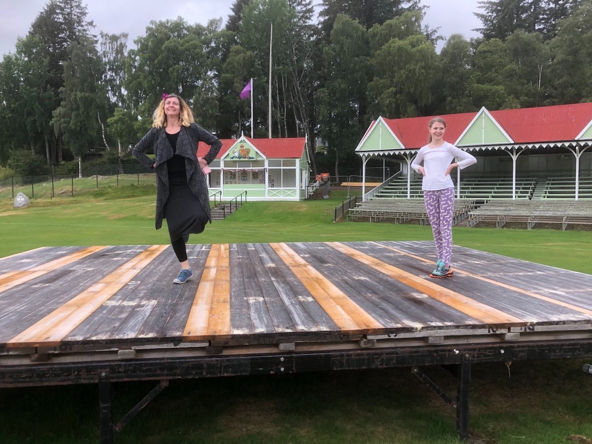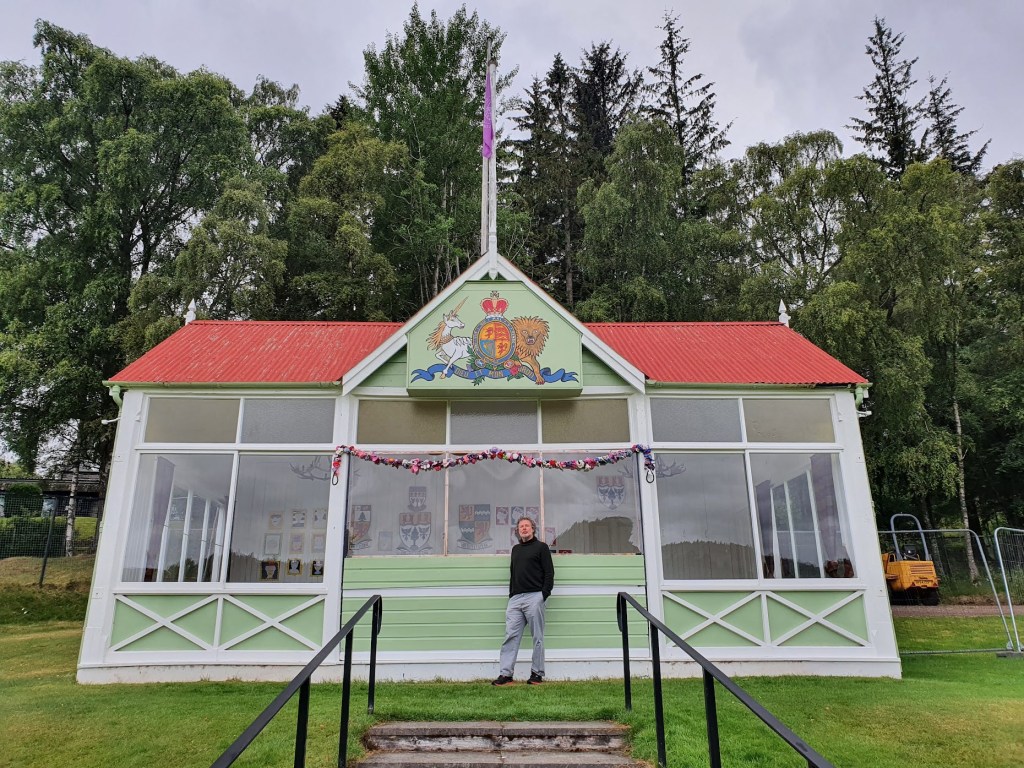 Ben looking regal in front of the Queen’s hut. This is where she sits during the Braemar Highland Games. I’ve got a photo of it all done up from when we went in 2017. See Sack racing in front of the Queen.