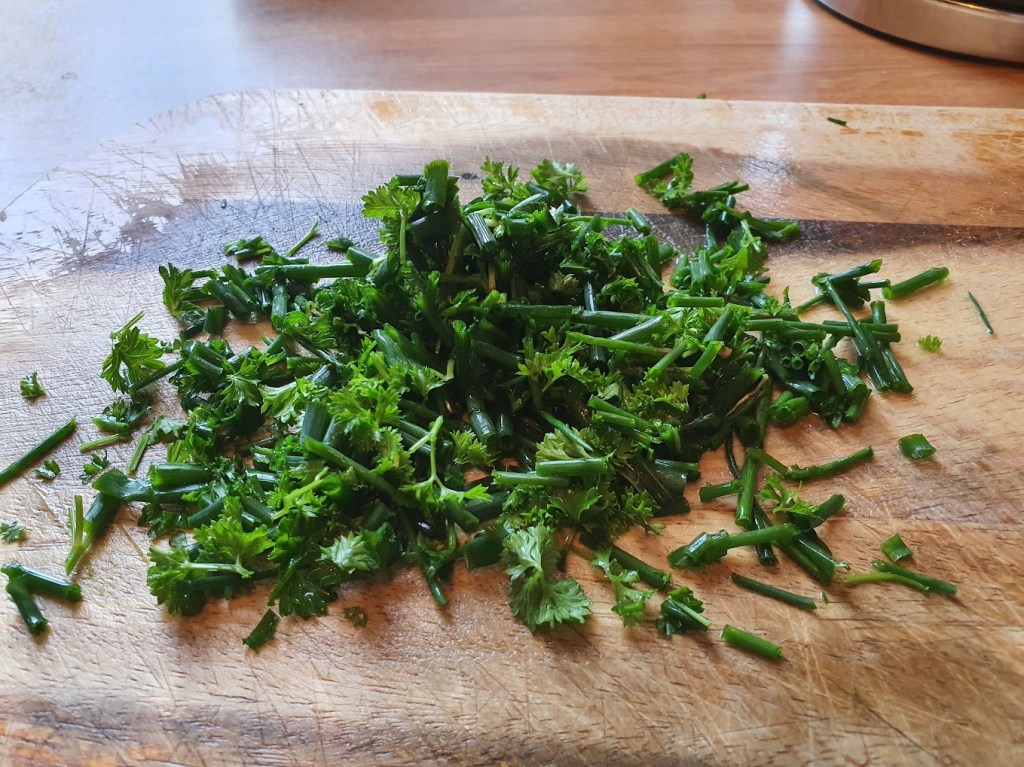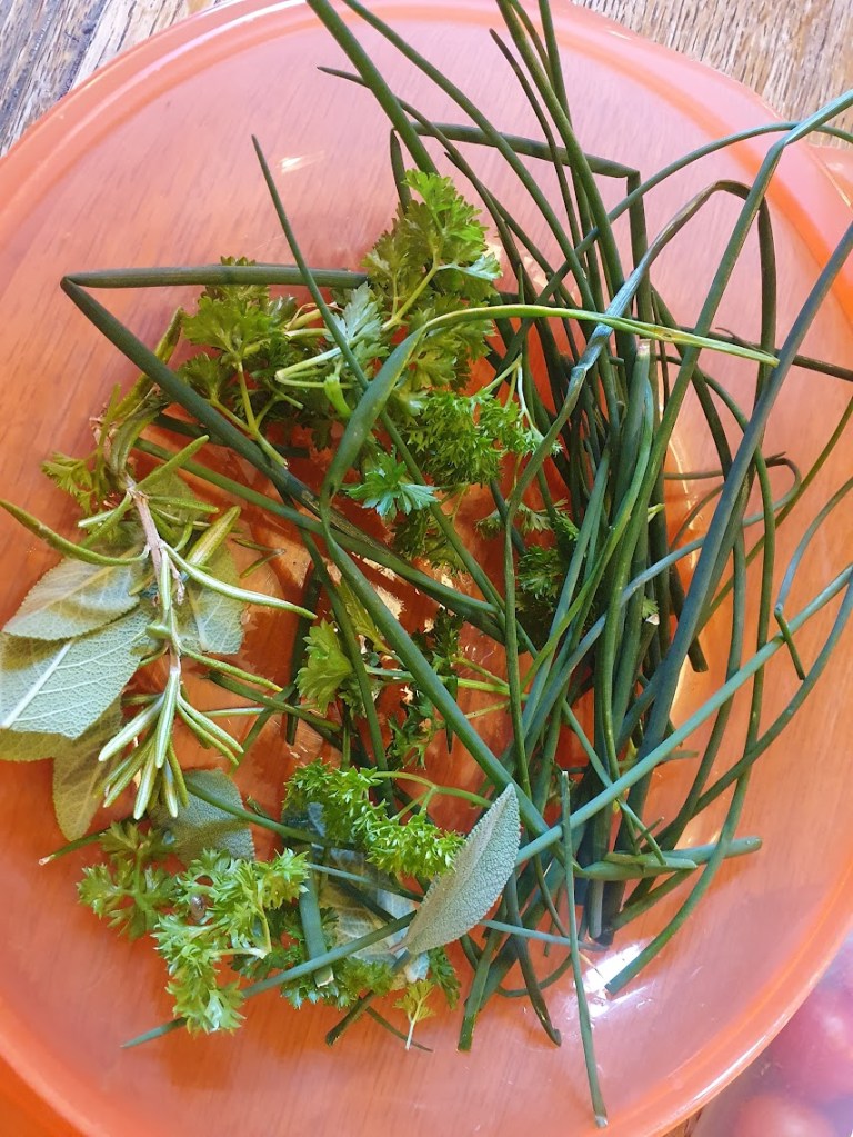 Since we gave up salt we’ve come to rely much more on herbs and I picked sage, rosemary, chives, and parsley from the garden for our dinner. The chives and parsley go in the mashed potato while the sage and rosemary go in the bean dish which is made from onion, garlic, cherry tomatoes from the garden, nettles from the garden, kale from the garden, chick peas, cannellini beans, apple cider vinegar, pepper and any other vegetables you want to put in. Frozen peas work well in it too. This is a very cheap and nutritious dish especially if you can forage for the herbs.