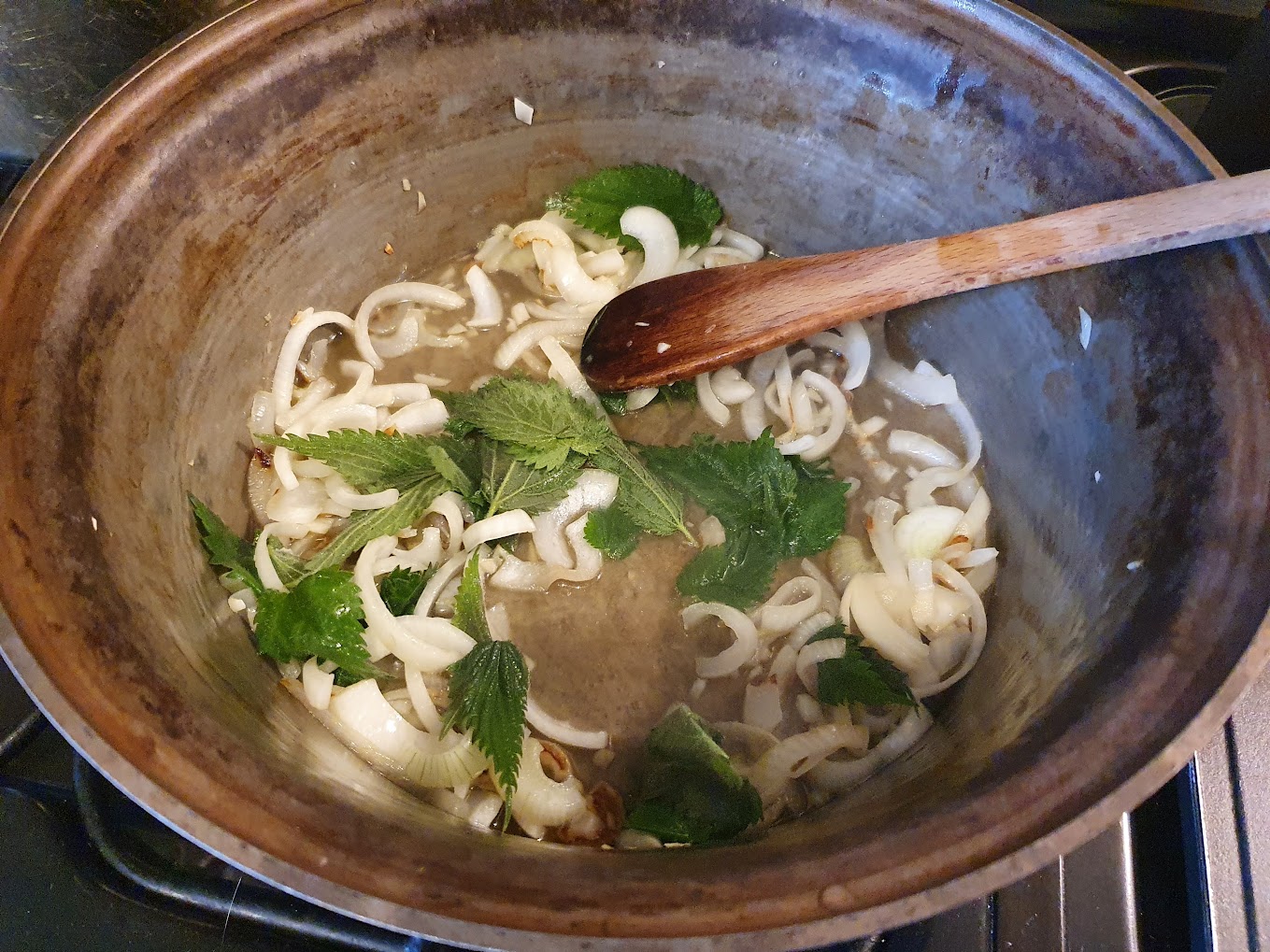 Tonight we’re home and I’m making my signature bean and mashed potato dish. Daniel really loves it and it’s so easy to make. Tonight I’ve gone foraging and have added some nettles to it.