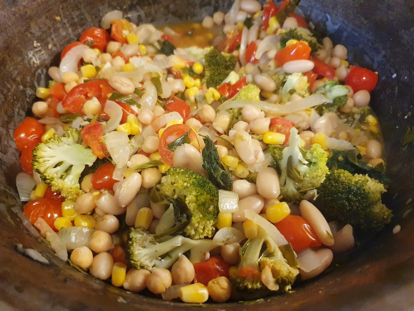 Since we gave up salt we’ve come to rely much more on herbs and I picked sage, rosemary, chives, and parsley from the garden for our dinner. The chives and parsley go in the mashed potato while the sage and rosemary go in the bean dish which is made from onion, garlic, cherry tomatoes from the garden, nettles from the garden, kale from the garden, chick peas, cannellini beans, apple cider vinegar, pepper and any other vegetables you want to put in. Frozen peas work well in it too. This is a very cheap and nutritious dish especially if you can forage for the herbs.