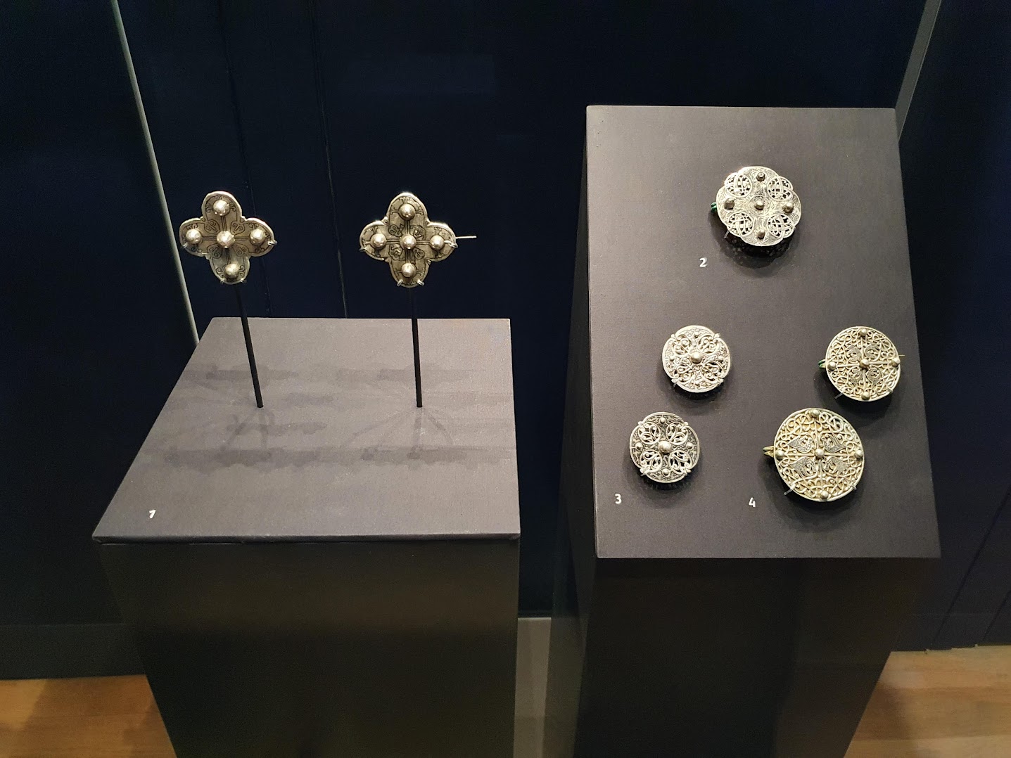 Also at the gallery is some Viking treasure – The Galloway Hoard – thought to have been buried in Scotland around AD 900. It includes some Anglo-Saxon brooches which you can see in the second photo.