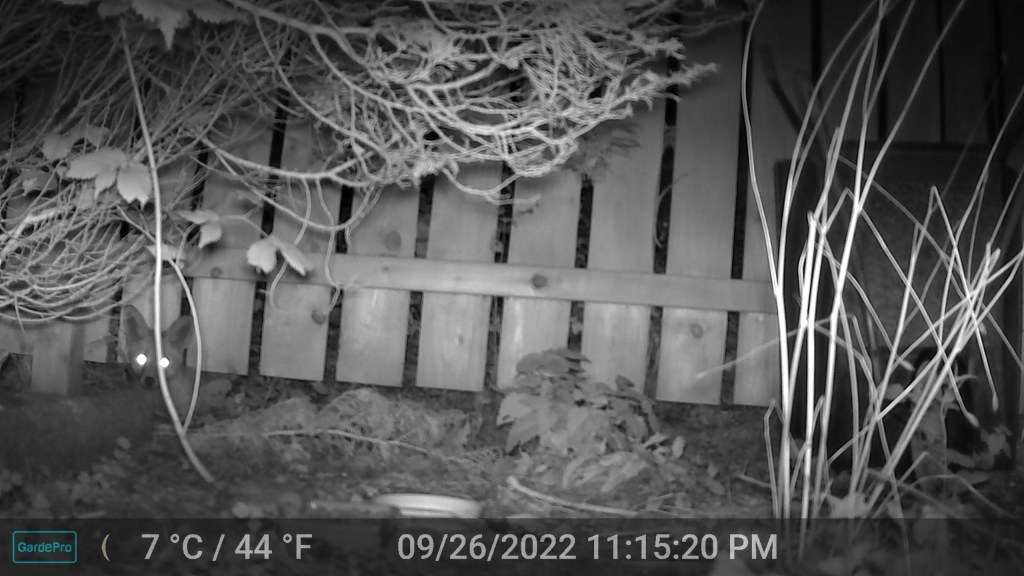 Fortunately we had a visitor in our backyard last night and the night before that has cheered me up a bit. Can you see the eyes poking under the fence in this next photo?