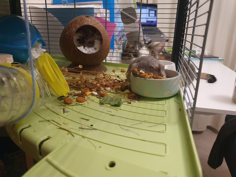 We’re loving having Rocket. He’s such a cool little dude. He seems quite happy in his new home. At least he never tries to escape even when the door is open. He likes taking food from our hands but doesn’t like being held. He loves, loves, loves his wheel and is very fond of food but who isn’t?