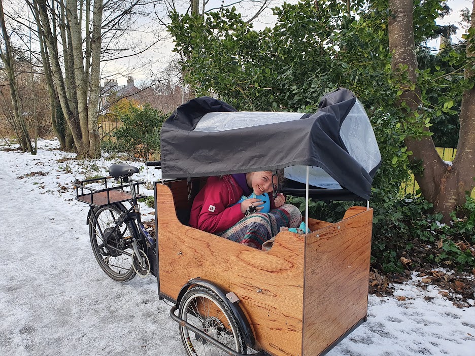 I cycled Elizabeth to highland dance today in the snow with Hoss, our cargo bike. I haven’t cycled the cargo bike for a while as Elizabeth cycles herself now but with all the snow on the bike path I felt the electric assist and the three wheels would make it easier which they did. It was safer than walking that’s for sure as it’s very easy to slip over in these conditions and A&E are full right now with people having slipped on pavements and broken bones. This is less of a problem on a bike, especially one with three wheels. Elizabeth got to ride inside with a blanket to keep her warm.