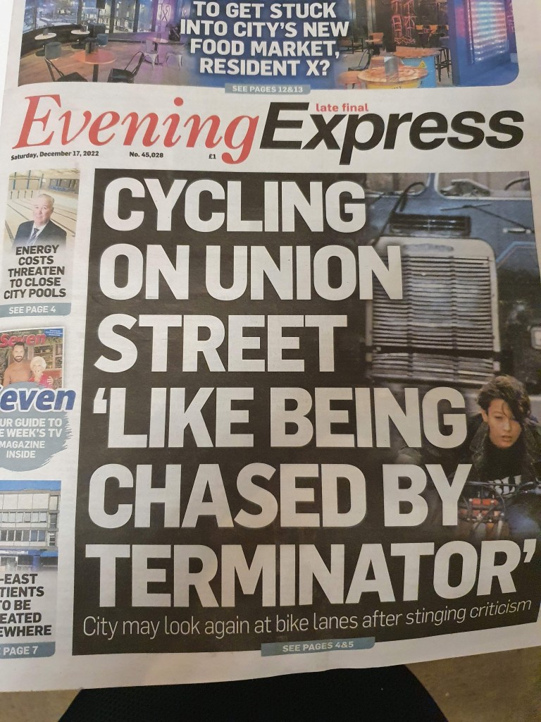 The article in the Press and Journal is excellent and they clearly had a lot of fun with the Terminator 2 analogy, leading with the headline, “Talks on segregated bike lanes ‘will be back’ amid claims Granite Mile cycling is like fleeing Terminator“.