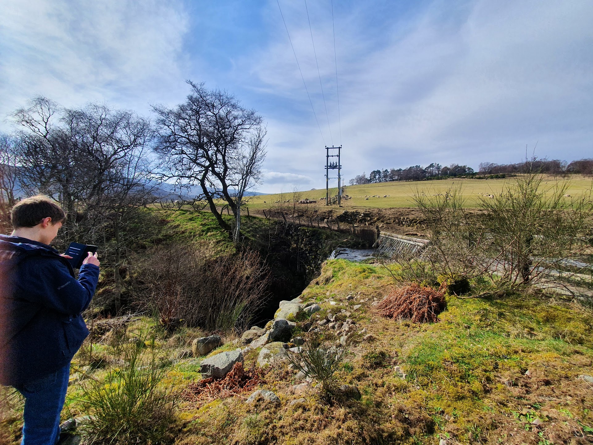 A rickety old wooden suspension bridge which is aptly named the Shakin Brig will let you cross the river at Edzell and walk along the other bank. In this next photo Ben is looking at a dog that accompanied us. When we started our walk the dog was on strike because the owner wanted to walk downstream while the dog wanted to walk upstream. He refused to move and she was just stood there patiently waiting. I’ve never seen such an obstinate dog especially where a walk is concerned. Eventually he accepted it and went bounding along, going for a swim along the way.