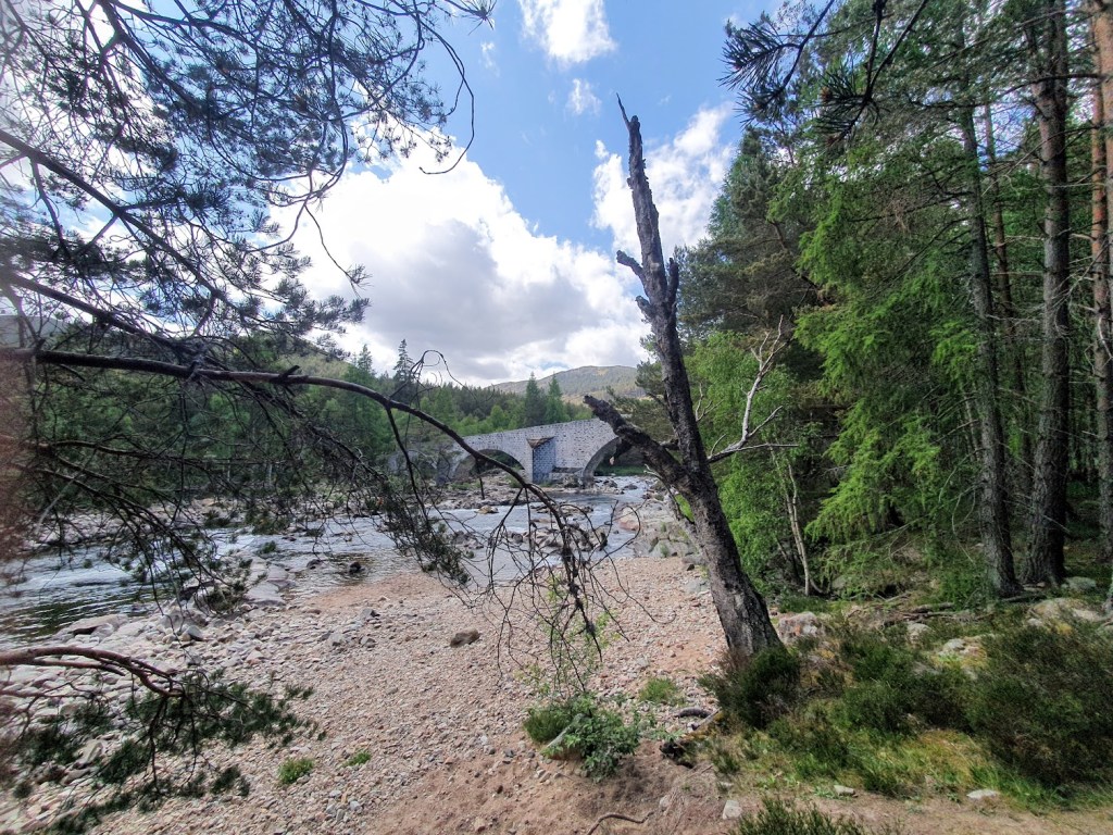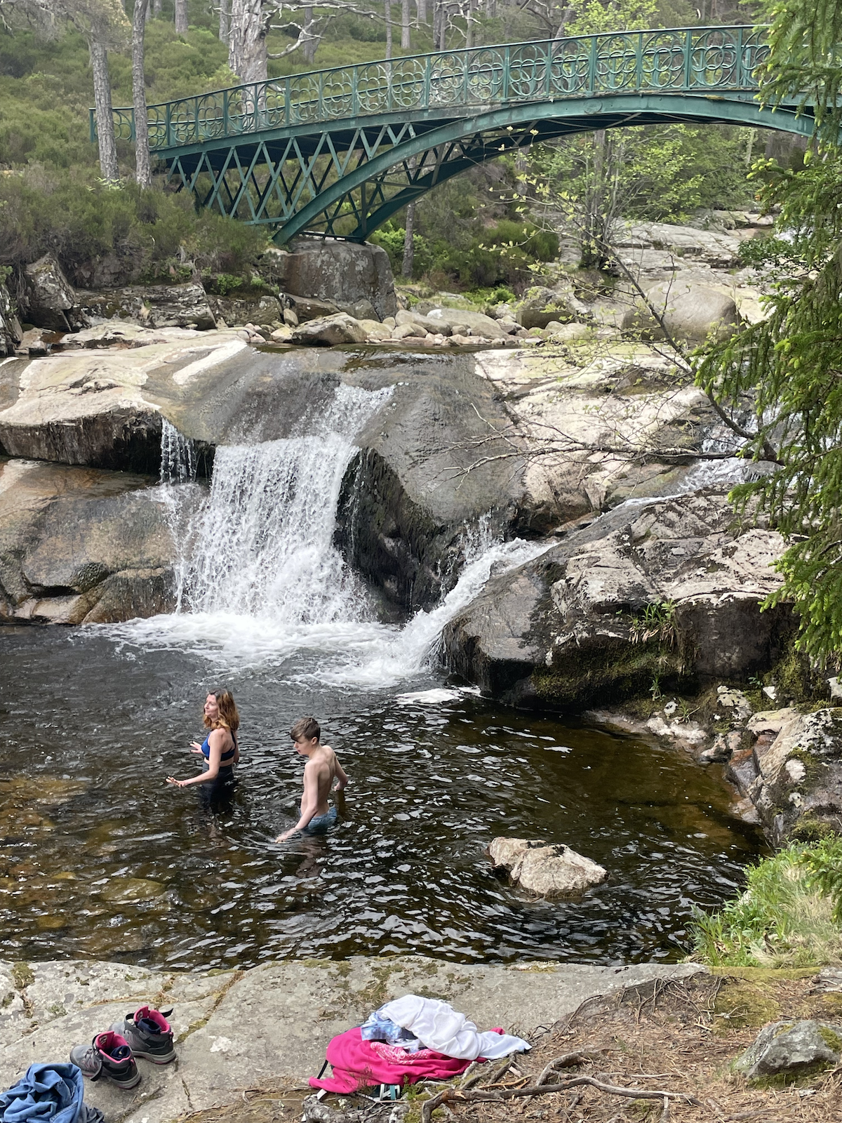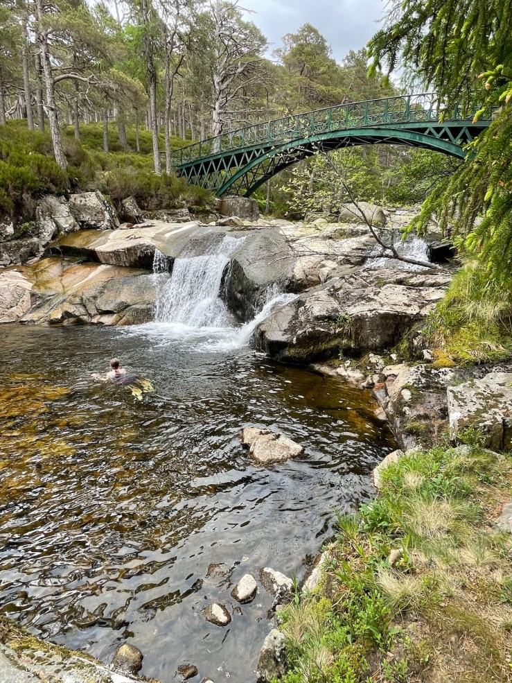 We’re just back from a tremendous day in the Cairngorms with Grandad. First was an early lunch at the Bothy which overlooks the Clunie River so you can sit outside and eat your lunch right next to this. We swam in it last year.