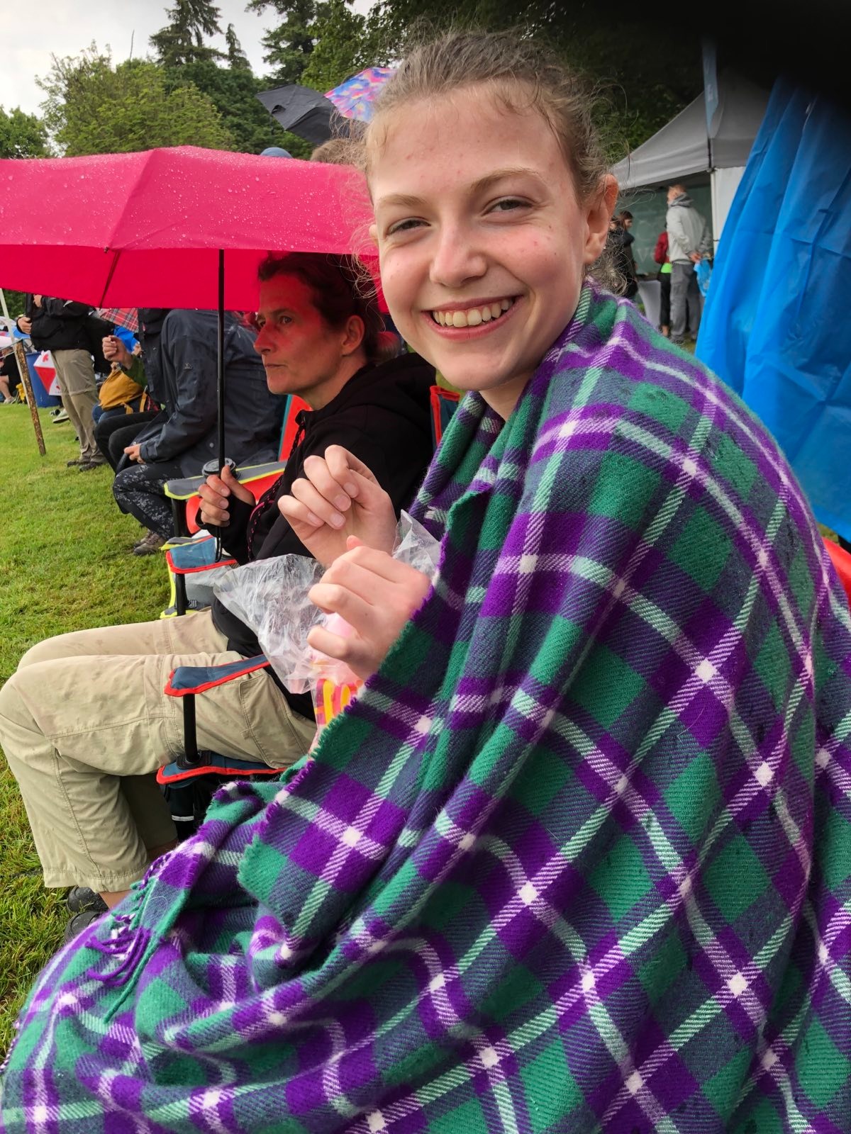To give Grandad a true taste of Scotland the weather turned on us and it poured with rain. This next photo is of me trying to wring out the picnic rug which got soaked.