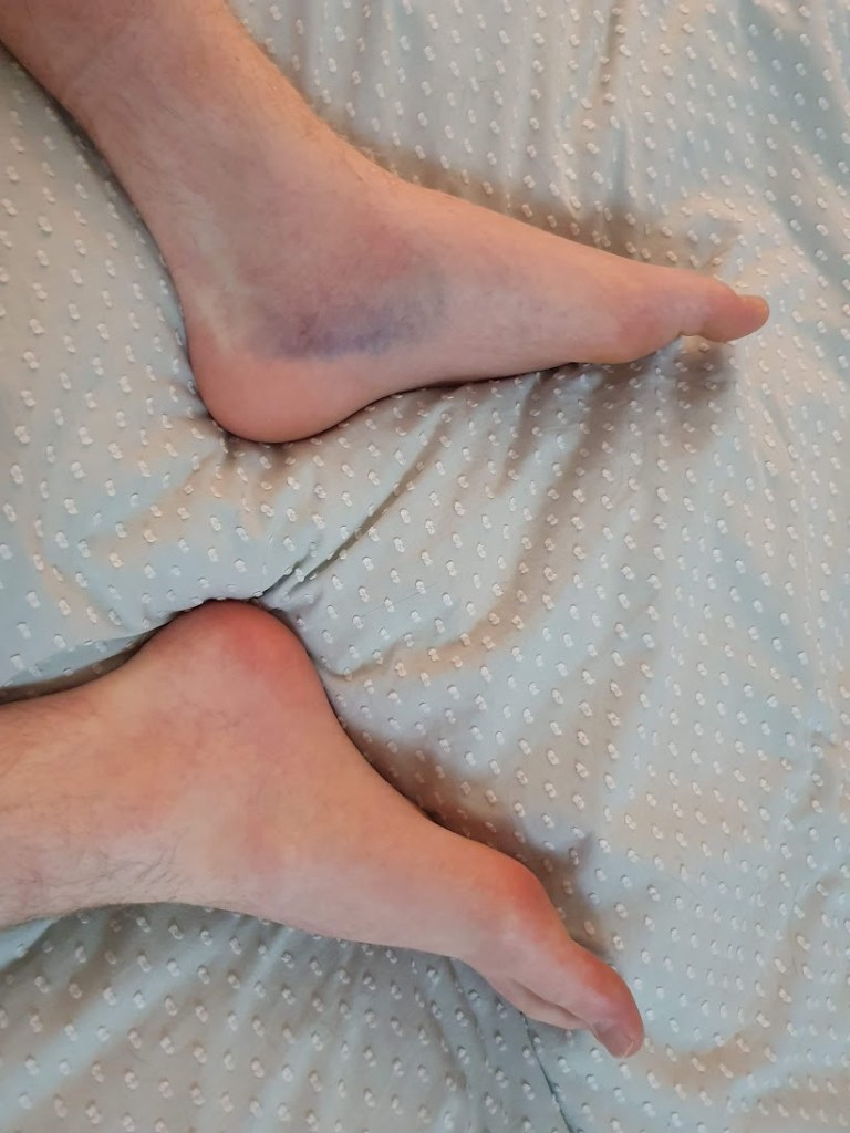 Daniel is still hobbling around on crutches. It has been more than a week now since he fell off his bike but just yesterday he started to be able to put a little bit of weight on his foot. He’s not quite ready to dispense with the crutches fully but maybe by the end of the week. His foot is still swollen. This photo was taken last night.