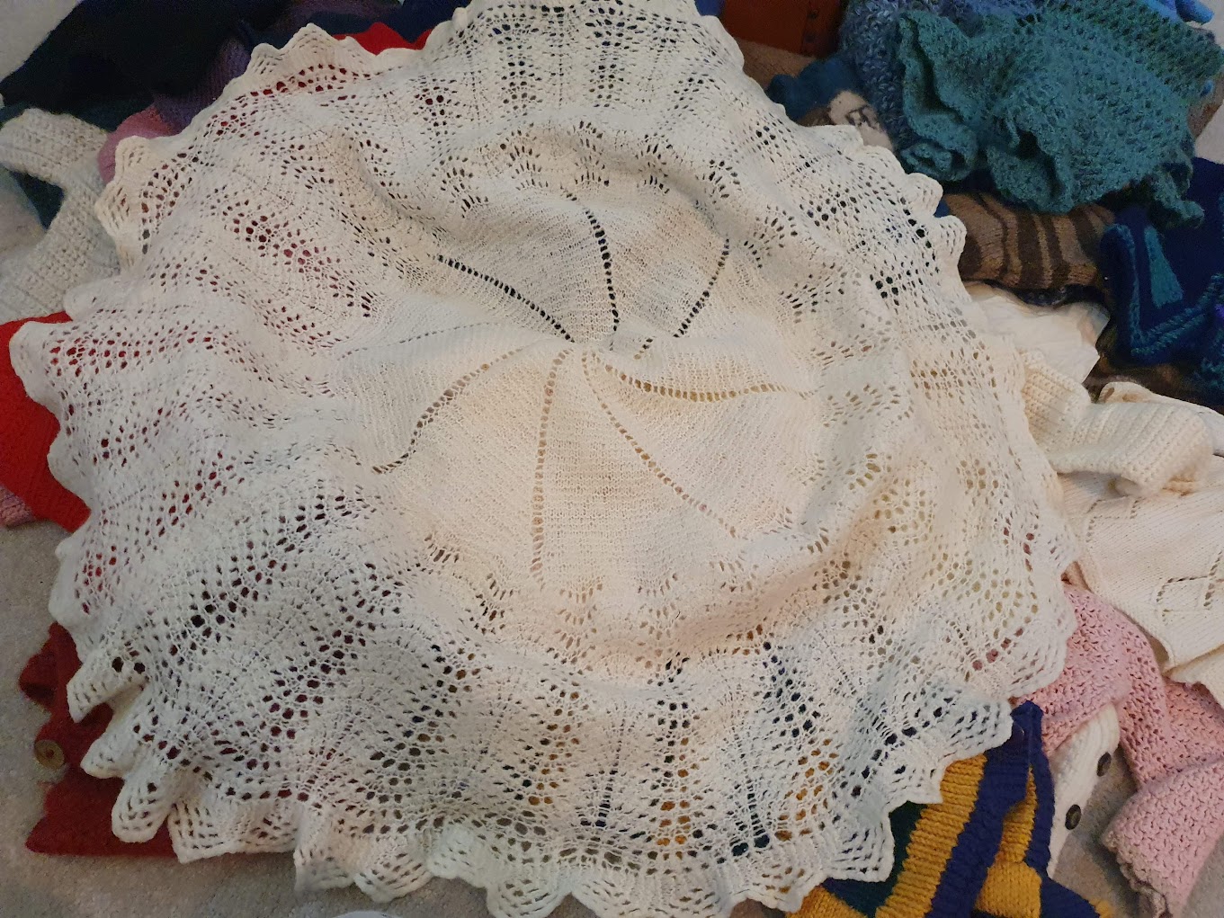 I’ve spent the past couple of days clearing out a cupboard containing bags of baby stuff. We’ve still got all the kids’ old baby clothes, nappies, and loads of beautiful knitted garments.