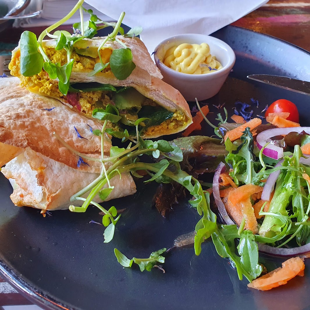 We don’t eat out very often these days because of my low-salt diet but the tofu scramble I had was very low in salt as I’m quite sensitive to it now and can taste it. Even if you’re not worried about high blood pressure, salt also raises the risk of kidney disease, osteoporosis, stomach cancer and dementia (Action on Salt, Salt and dementia) as well as causing fluid retention. I left the hollandaise sauce though as that will have been very salty. I had the tofu scramble on flat bread.