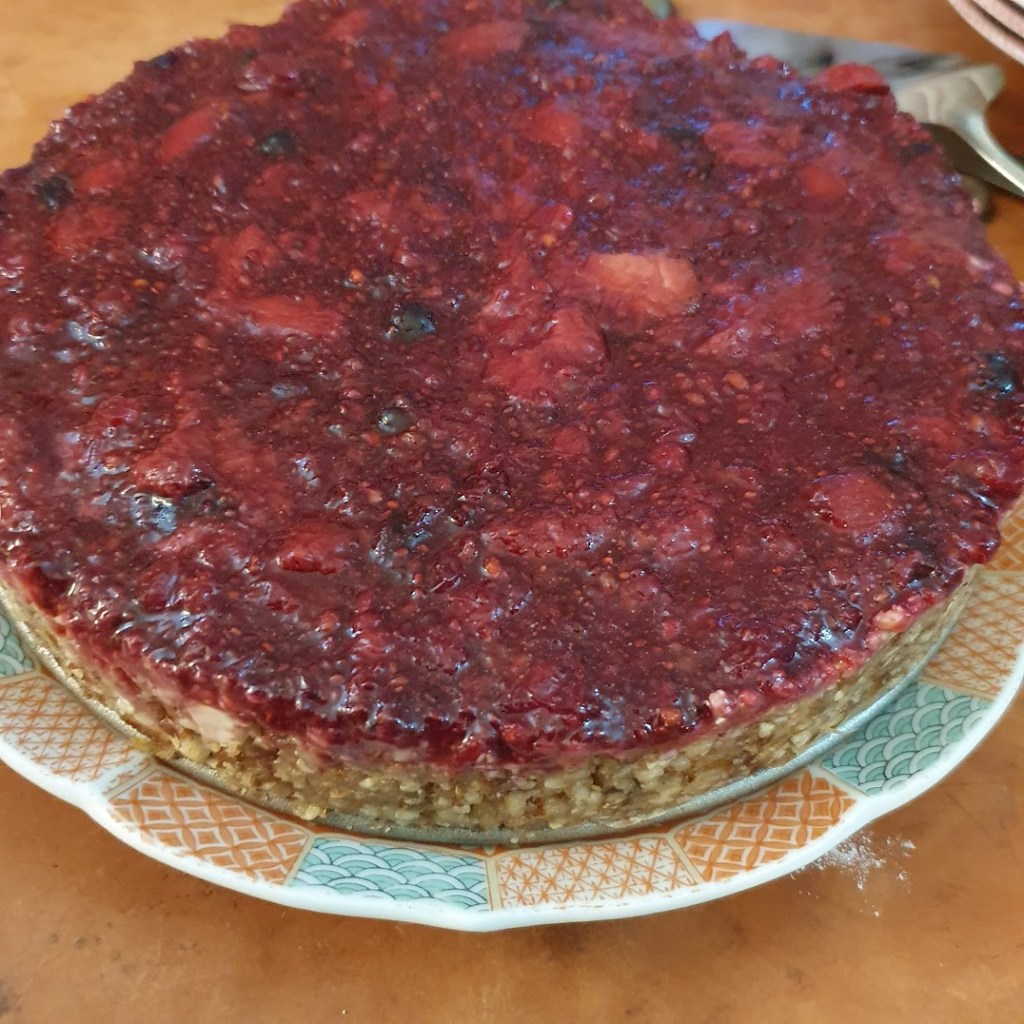 - For the crust, soak the dates in water for about 5 minutes then pulse with the nuts in a food processor but not too long as the base should be crunchy rather than smooth.