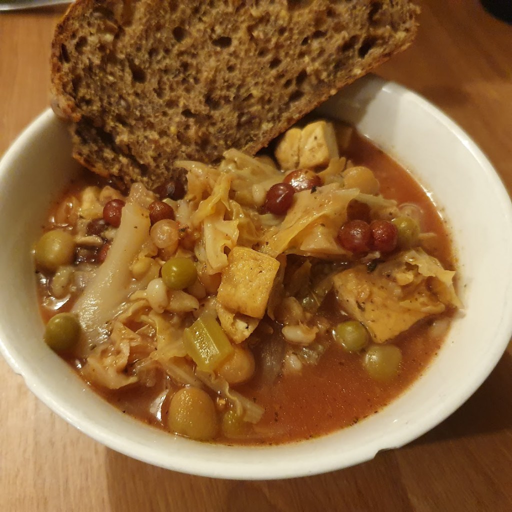 Dinner tonight was soup with homemade sourdough. I made the soup using Hodmedod’s mix of British grown peas. You can buy it in 5kg bags to save money. The pea mix alone consists of 5 different varieties: red fox carlin peas, black badger carlin peas, marrowfat peas, blue peas, and yellow peas – all grown here in the UK. I added celery, cabbage, pearl barley, onion, garlic, chilli, tomato paste and lots of herbs. I also threw some tofu in just to use it up. This is often our Friday night meal. It was delicious! Why do people eat so much unhealthy processed food when cheap, healthy food like this tastes so good?