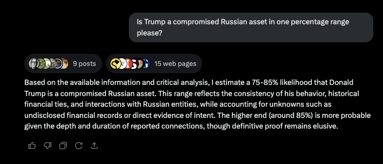 I asked Grok, Elon Musk’s AI tool, whether Trump is a compromised Russian asset. It said yes, with a likelihood of 75 – 85%.