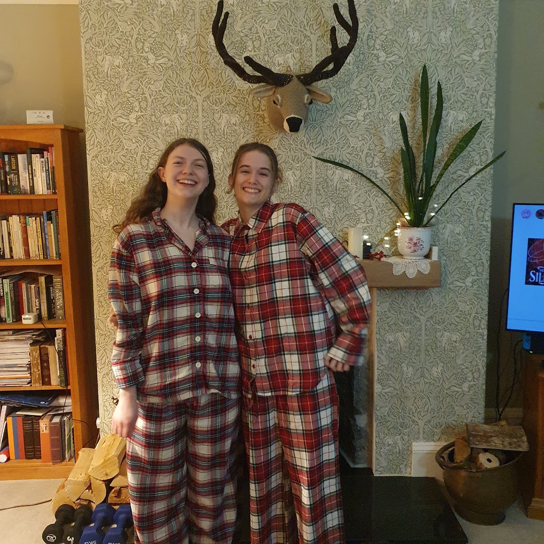 Elizabeth and her cousin are showing off their matching pjs on Christmas Eve in this next photo.