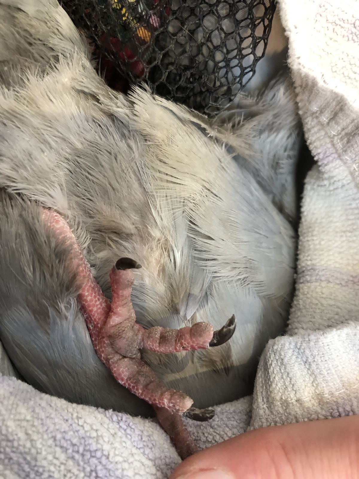 Pigeons foot tangled up in cotton thread