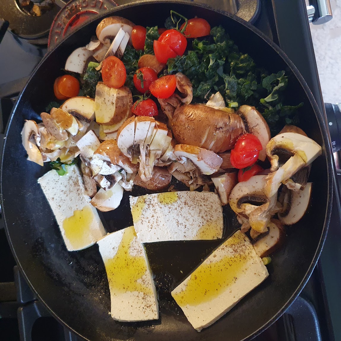It’s very simple. Here are the raw ingredients: tofu, spring onion, tomatoes, kale, mushrooms, hummus, pepper, and olive oil.