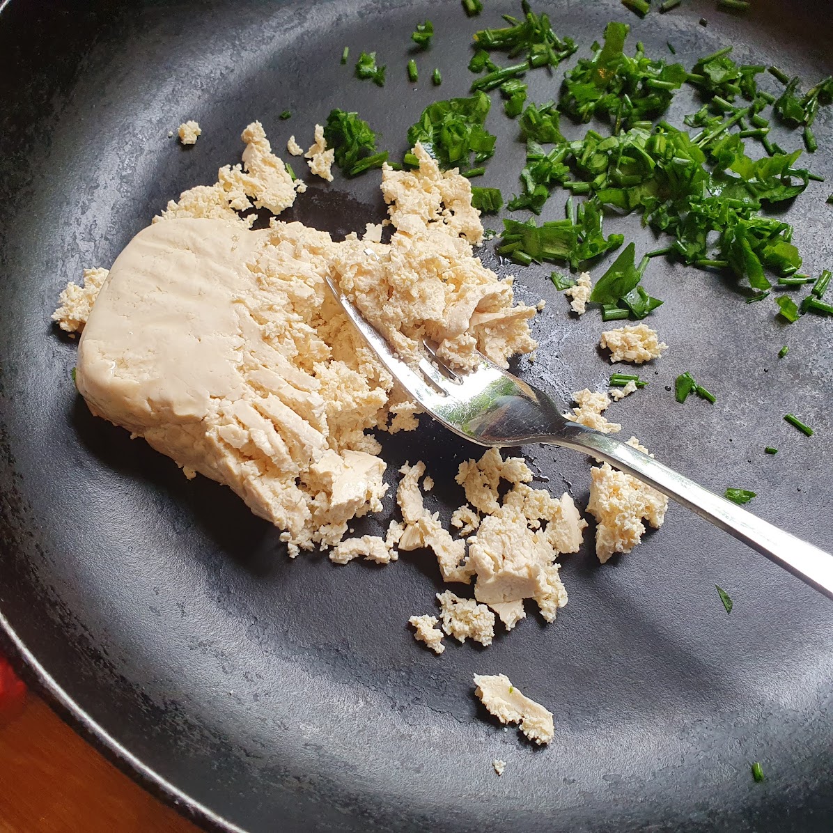 This week I made scrambled tofu – think scrambled eggs but with tofu. It worked splendidly. I put some chives and wild garlic from the garden into it plus some turmeric but you could put anything you would normally mix into scrambled eggs. I also added oat milk.
