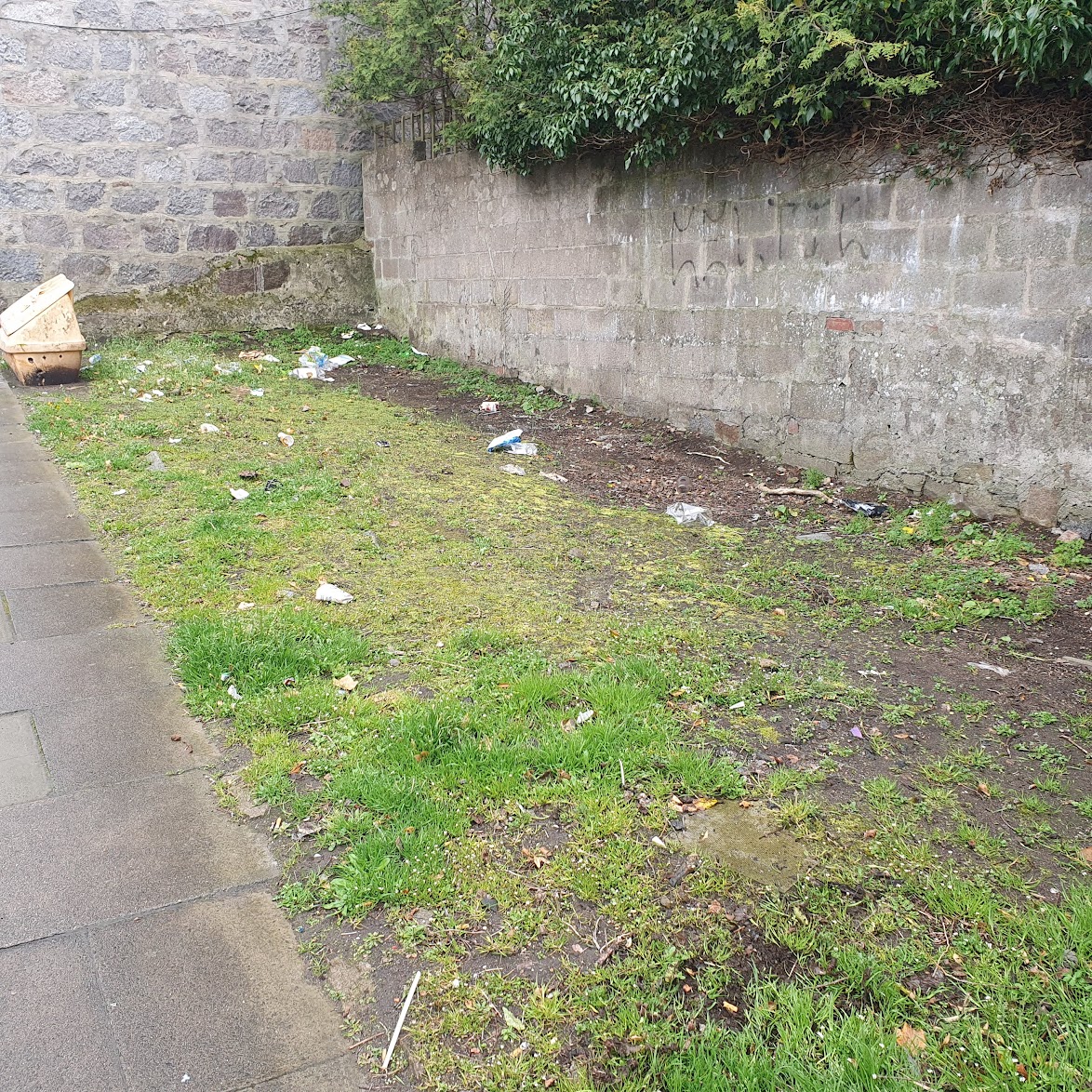 Today I spent a couple of hours picking up litter in Torry. We walk there every Friday evening for Elizabeth’s musical theatre class and I was horrified by all the litter I saw there last night so went back today to clean some of it up. I feel as though I barely scratched the surface so I’ll make it a regular activity. But I did clean up this little patch on Walker Place. Here’s before and after.